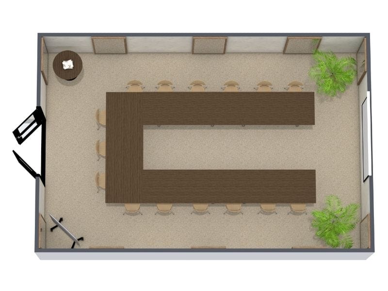 Bei einer U-förmigen Anordnung werden drei rechteckige Tische in Form eines U aufgestellt, wobei die offene Seite zur Präsentationsfläche zeigt. Dieses Layout eignet sich besonders für Schulungen, Seminare oder moderierte Workshops.