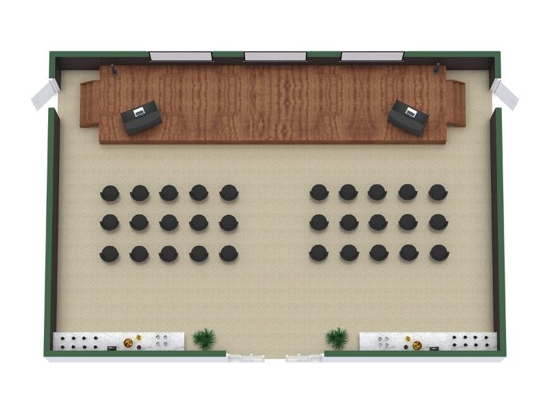 Da keine Tische eingeplant sind, können viele Personen untergebracht werden. An der Stirnseite befinden sich meist Podium, Rednertisch oder Bildschirm.