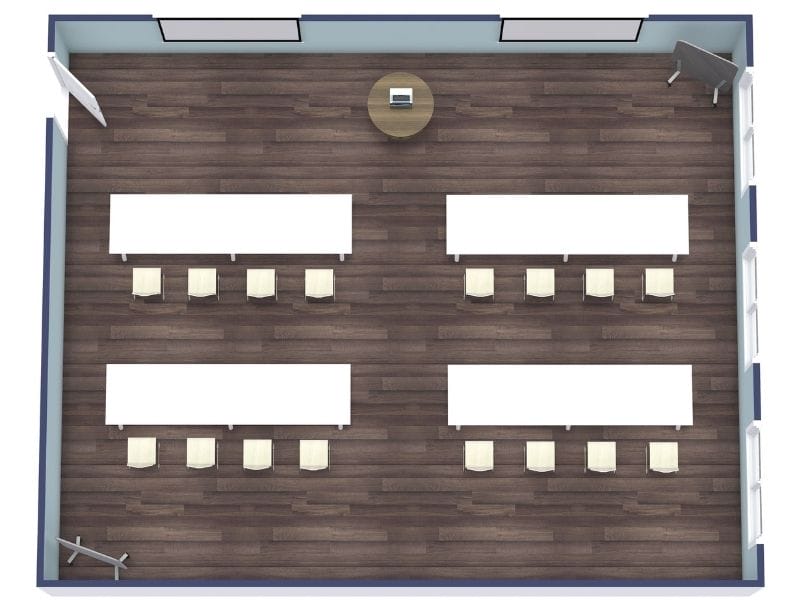Die Klassenzimmerbestuhlung ähnelt der Theaterform, bietet jedoch zusätzlich Tische vor jeder Sitzreihe. Sie eignet sich besonders für Schulungen oder Besprechungen, bei denen Laptops genutzt oder Notizen gemacht werden.