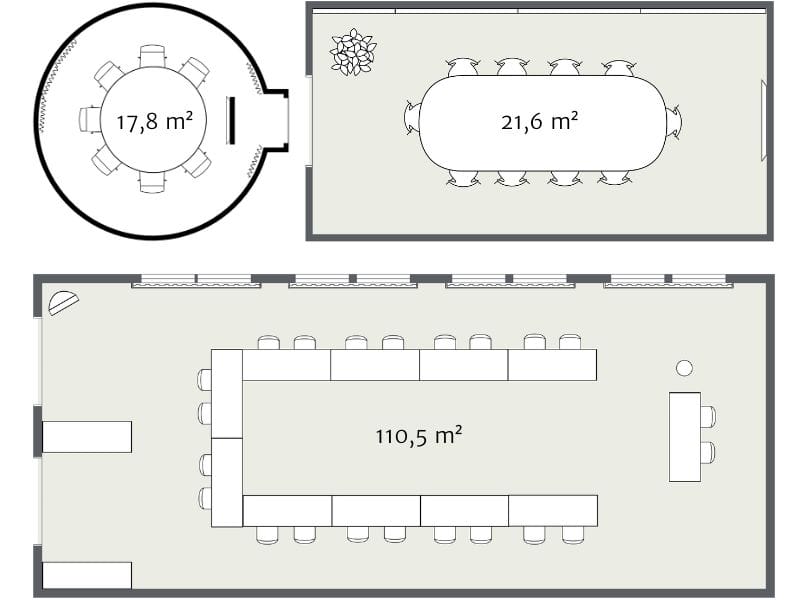 • Kleine Konferenzräume: ca. 15–20 m² für 2–8 Personen