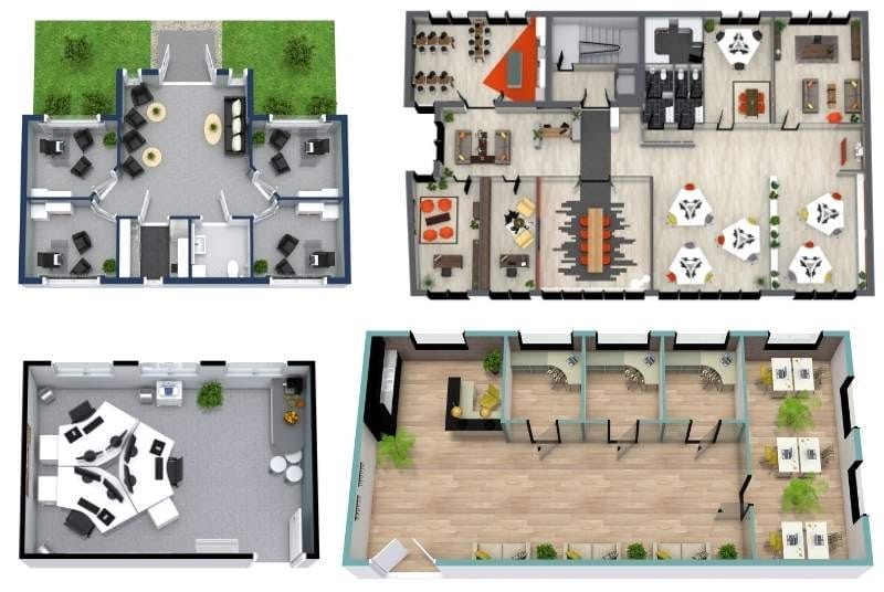 Grundrisse für Büros mit offenen Arbeitsbereichen, Besprechungszonen und moderner Büroeinrichtung.