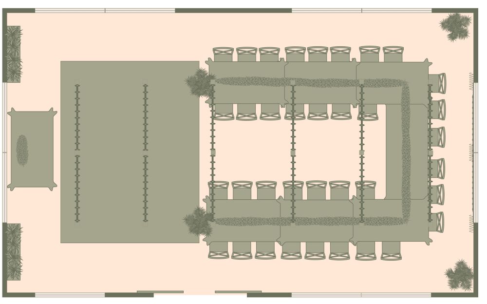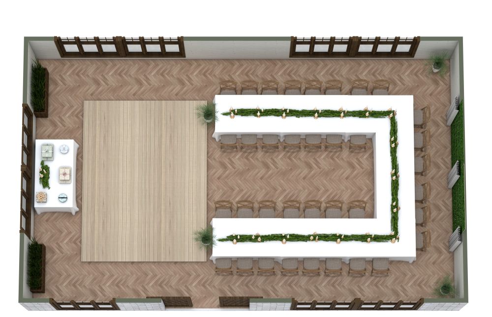 Wer sagt, dass eine Hochzeit auf dem Bauernhof nicht auch elegant und schick sein kann? Diese rustikale Scheune als Hochzeitslocation mit Tanzfläche bietet als Veranstaltungsort modernen Stil und dezente Raffinesse. Betreten Sie den Raum durch ein Paar Scheunentore. Die schönen Hartholzböden werden durch weiße Ziegelwände und gewölbte Decken mit Lichterketten im Freien perfekt ergänzt. Ein U-förmiger Tisch mit strahlend weißer Tischdecke und rustikalen Holzstühlen bietet der Hochzeitsgesellschaft ausreichend Platz zum Zusammensitzen. Goldene Kerzenständer und einfaches Grün sorgen für eine charmante, aber unaufdringliche Tischdekoration. Übergroße, mit Holz verkleidete Fenster lassen viel natürliches Licht in den Raum strömen. Eine grüne Wand dient als Blickfang auf der einen Seite des Raumes, während auf der anderen Seite ein kleiner Tisch für die Gäste und den Kuchen steht. Wenn Sie auf der Suche nach einer intimen, charmanten und eleganten Hochzeitslocation sind, können Sie mit dieser Option nichts falsch machen.