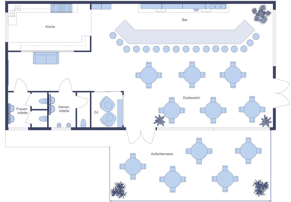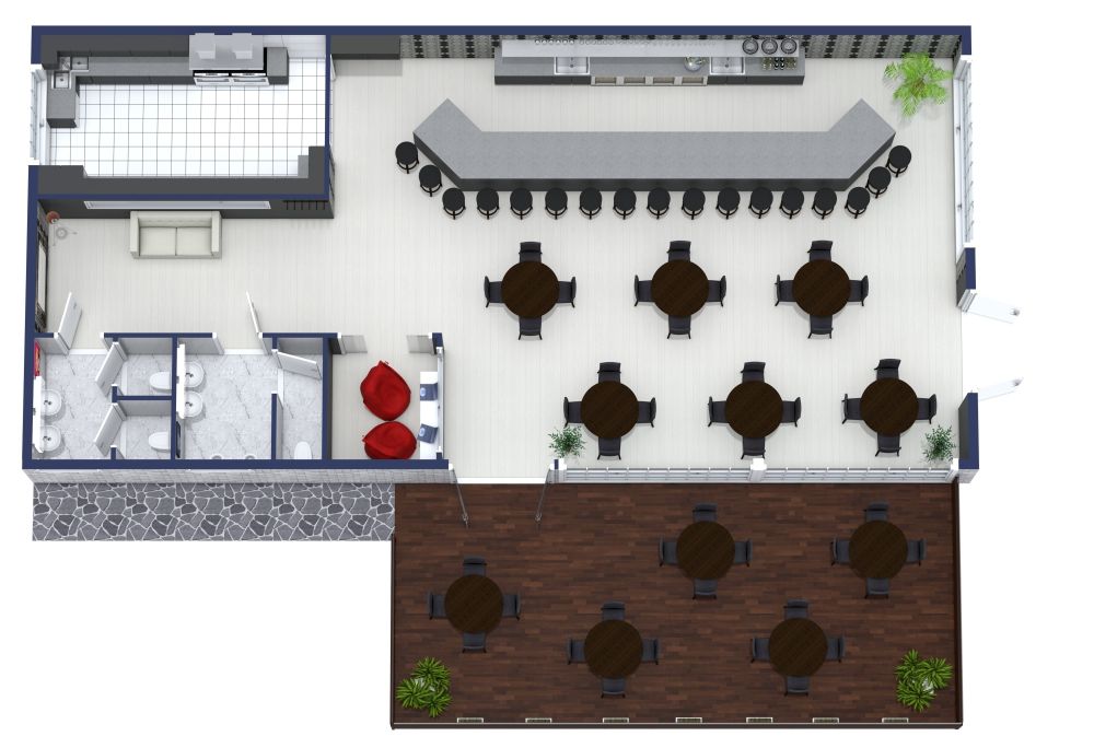 Suchen Sie einen eleganten, modernen Raum für intime Treffen? Diese Bar mit Essbereich und DJ-Stand ist der perfekte Ort, um einen unvergesslichen Abend zu verbringen. Ein hellgrauer Fußboden und ein übergroßes Fenster bilden einen Kontrast zu den dunklen, stimmungsvollen Wänden. Die Gäste können ihr Essen und ihre Drinks an einem der sechs runden Tische oder an der langen, schicken Bar genießen, die mit ihrer dramatischen Kulisse den Mittelpunkt des Raums bildet. Der Küchenbereich ist mit weißen Fliesen und schlichten grauen Arbeitsplatten ausgestattet. Drei Bäder befinden sich im hinteren Teil des Raums, in der Mitte steht ein flippiges DJ-Pult mit roten Sesseln und einem Panoramafenster. Die Außenterrasse macht diese Bar zu etwas ganz Besonderem. Er verfügt über einen dunklen Holzboden, freiliegende Ziegelwände und Sitzgelegenheiten, die zum Innenraum der Bar passen.