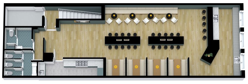 In dieser Cocktailbar NYC herrscht moderne Schlichtheit vor. Der lange, rechteckige Raum ist mit stimmungsvollen blaugrauen Wänden und einem hellen Parkettboden ausgestattet. Eine schlichte schwarze Tischplatte befindet sich auf einem Paar langer, hoher Tische mit Barhockern in der Mitte des Raumes. Eine lange, elfenbeinfarbene gepolsterte Bank verläuft entlang einer Seite der Wand und bildet eine Ergänzung zu den runden, schwarzen Tischen und weißen Stühlen. Auf der anderen Seite des Raums befinden sich gemütliche Sitzecken mit Holztischen und elfenbeinfarbenen Sitzgelegenheiten. Leuchtend gelbe Lampen und passende Hängelampen setzen einen farblichen Akzent zum dezenten Farbschema der einzelnen Tischgruppen. Der Küchenbereich verfügt über einen hellgrauen Bodenbelag und eine großzügige Arbeitsfläche. Die Toiletten befinden sich im hinteren Teil der Bar, neben der Treppe und einem großzügigen Abstellraum.