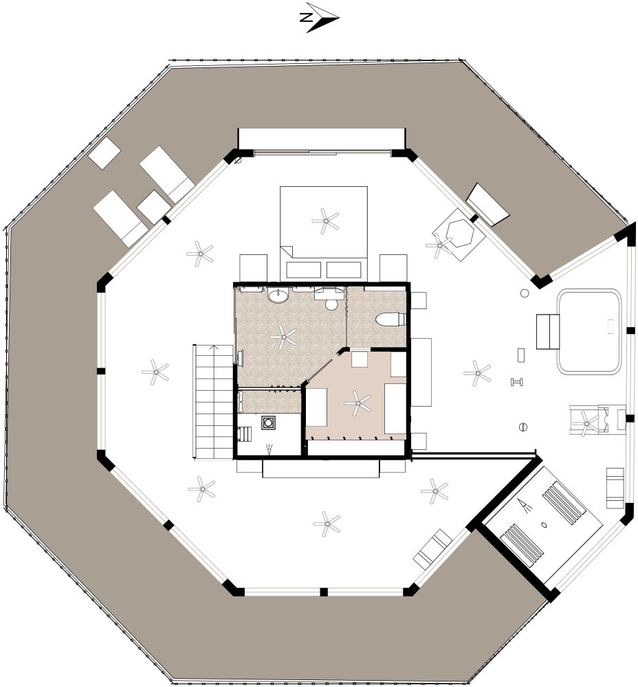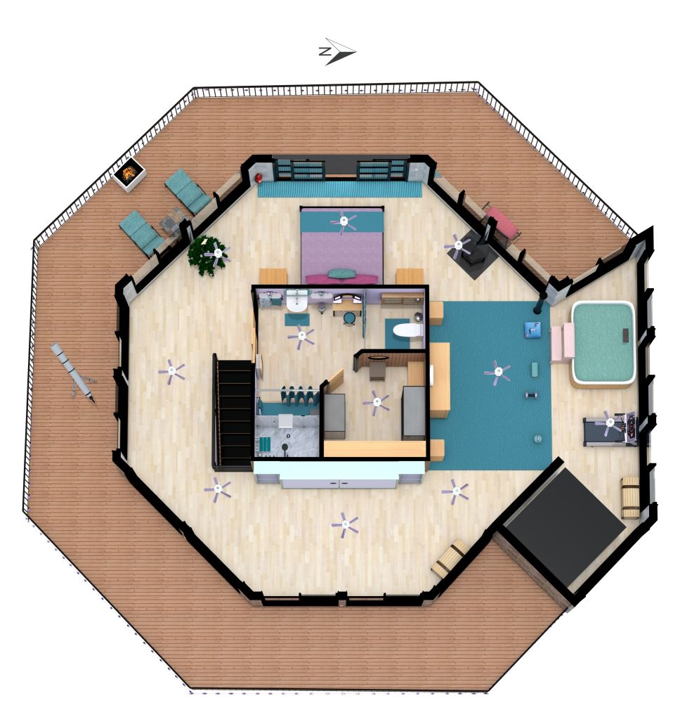 Dieser Grundriss eines Traumhauses besteht aus zwei achteckigen Ebenen und einer Garage. Auf jeder Ebene gibt es einen Innenbereich und einen Außenbereich mit vielen Fenstern dazwischen. In der Mitte jedes Innenbereichs befindet sich ein abgetrennter Bereich mit einem Badezimmer und einer Toilette. Auf einer Ebene gibt es eine Küche, die in einen Essbereich mit einem Tisch und vier Stühlen übergeht. Daran schließt sich ein Arbeitsbereich mit einem Schreibtisch und einem Stuhl an. Auf einer anderen Ebene befindet sich ein Schlafzimmer mit einem Doppelbett. Daran schließt sich ein Fitnessraum mit einem Laufband und einem Whirlpool an. Es gibt auch einen Außenbereich mit mehreren Chaiselongues. Insgesamt handelt es sich um ein unkonventionelles Haus mit einem offenen Grundriss, aber es bietet eine atemberaubende Aussicht und mehr als genug zusätzlichen Platz, um sich nach Belieben einzurichten.