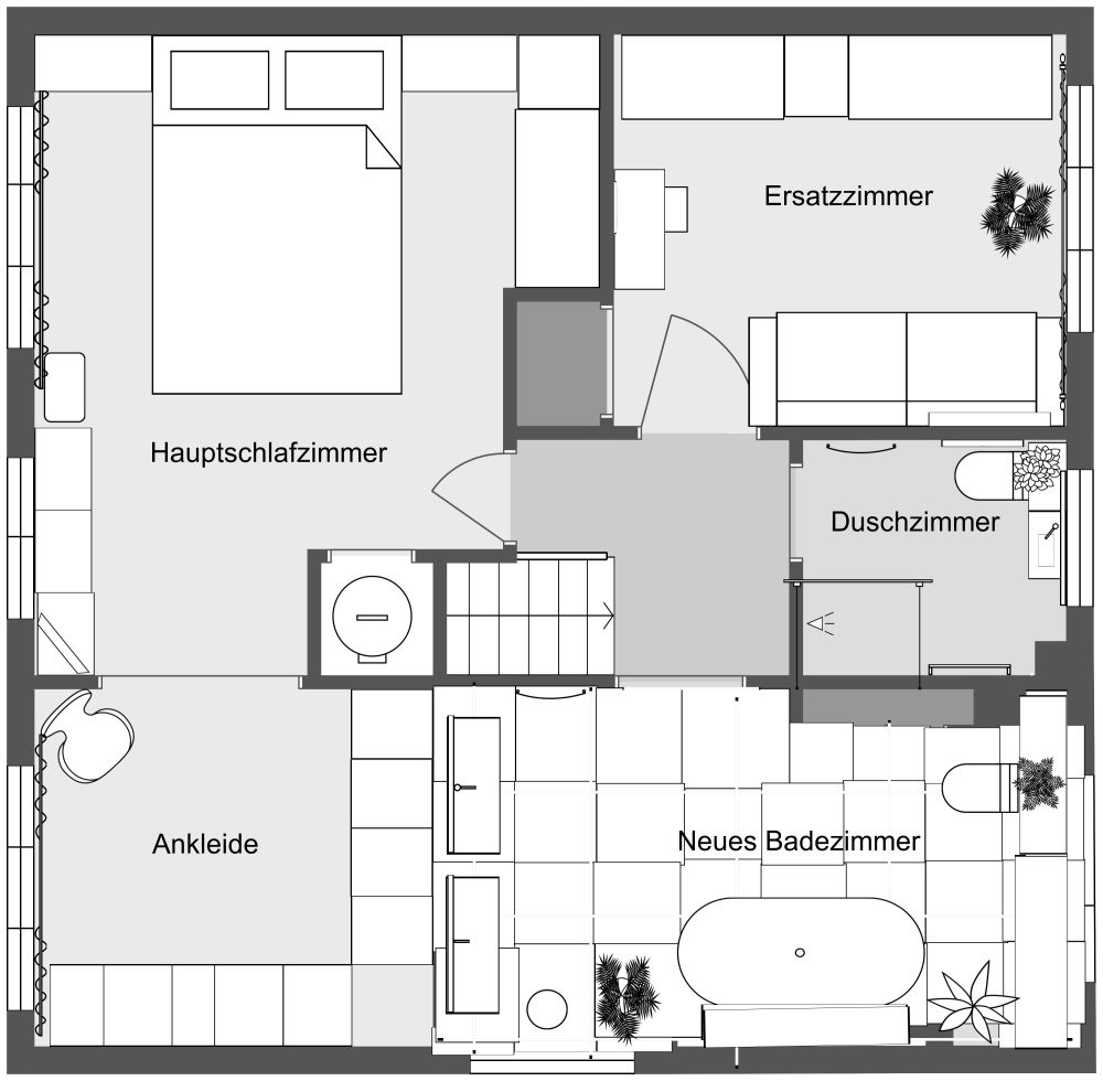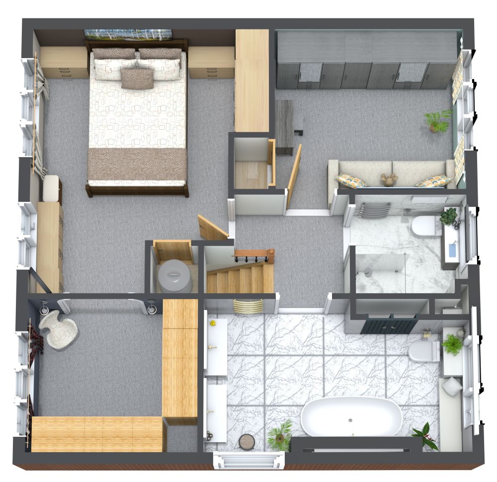 In diesem Hausplan unter 100 Quadratmetern mit 2 Schlafzimmern ist Platz für alles, was Sie brauchen könnten. Am Eingang gibt es genug Platz, um zwei Autos zu parken. Sobald Sie das Haus betreten, finden Sie auf der rechten Seite einen Waschraum und einen Hauswirtschaftsraum sowie auf der linken Seite ein Wohnzimmer mit einem L-förmigen Sofa, einem Sessel, einem Kamin und einem Fernseher. Es gibt zwei Küchen mit L-förmigen Theken und einen Arbeitsbereich mit einem langen Schreibtisch. Der Essbereich ist mit einem Tisch und vier Stühlen ausgestattet, ein weiterer Wohnbereich mit einem L-förmigen Sofa. Es gibt zwei Terrassen mit Couches und einem Tisch mit vier Stühlen. Im Hinterhof gibt es ein Nebengebäude und ein kleineres Obergeschoss. Hier gibt es ein Schlafzimmer mit einem Doppelbett, ein weiteres Zimmer mit einer Couch und Schränken, ein Ankleidezimmer mit zwei langen Schränken und ein großes Badezimmer mit einer skulpturalen Badewanne.