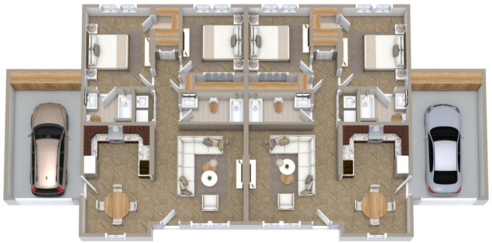 Erdtöne herrschen in diesem modernen Doppelhausplan vor. Wenn Sie durch die Eingangstür auf beiden Seiten des Doppelhauses treten, werden Sie einen offenen Grundriss vorfinden. Rustikale Holzböden erstrecken sich über das gesamte Haus. Das Wohnzimmer verfügt über eine auffällige Holzvertäfelung, die den Mittelpunkt des Raumes bildet, während die Küche mit dunklen Schränken und gesprenkelten Marmorarbeitsplatten ausgestattet ist. Die beiden Schlafzimmer sind geräumig und hell und verfügen über zusätzliche Holzpaneele, die das klare Weiß der Wände auflockern. Die beiden Vollbäder sind mit schönen, detaillierten Fliesen und Messingbeschlägen ausgestattet. Auf beiden Seiten des Doppelhauses befindet sich eine Garage mit einem Auto, die durch eine Tür am Essbereich zugänglich ist. Ihre Familie wird dieses einfache, aber komfortable Doppelhaus sicher lieben.