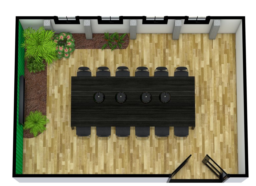 Ihre Kollegen und Sie werden sich auf ein Treffen in diesem einzigartigen Konferenzraum freuen. Wenn Sie durch die beiden Flügeltüren eintreten, finden Sie einen rechteckigen Raum mit weichen grauen Wänden und auffälligen Hartholzböden vor. Eine hellgrüne Akzentwand verleiht dem Raum einen modernen Touch und bildet den perfekten Hintergrund für den Fernseher. Vier schwarz eingefasste Fenster säumen eine der Wände, so dass viel Sonnenlicht in den Raum fällt. Diese Fenster werden durch graue Balken getrennt, die die Decke und die Wand säumen. Über dem schicken schwarzen Konferenztisch hängen vier Pendelleuchten. Der Tisch ist mit zwölf passenden Stühlen bestückt. Eine Auswahl an Topfpflanzen und Bäumen in einer Ecke des Raums trägt zu einem frischen und modernen Eindruck bei in diesem Konferenzraum Grundriss.