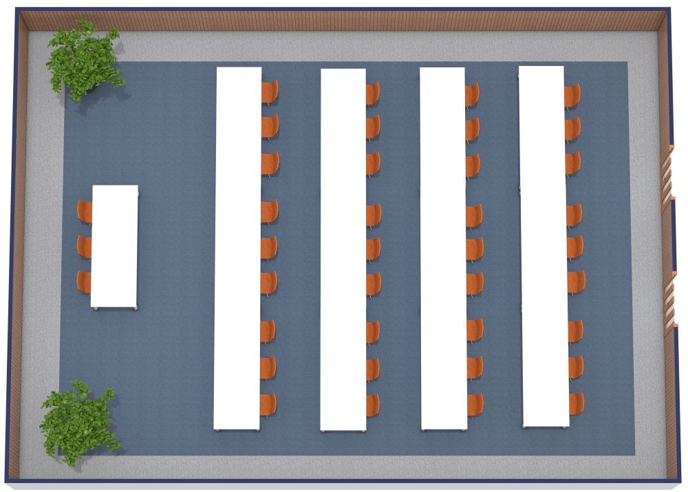 Dank seiner schlichten, aber ansprechenden Ästhetik werden Sie sich auf Ihre Sitzungen in diesem Grundriss für einen Konferenzraum freuen. Der geräumige Grundriss ist mit einem weichen blauen Teppich ausgestattet, der mit einer grauen Umrandung versehen ist, sowie mit modernen holzgetäfelten Wänden, die zu seiner entspannten Atmosphäre beitragen. Vier lange weiße Tische nehmen den größten Teil des Raums ein, an denen jeweils neun orangefarbene Drehstühle stehen. Diese Stühle stehen vor einem kleineren Tisch an der Vorderseite, drei weitere passende Stühle stehen in der entgegengesetzten Richtung. Zwei große Zimmerbäume stehen in den Ecken des vorderen Teils des Raums und tragen zu seiner stilvollen, aber unaufdringlichen Optik bei. Zwei Paare von Doppeltüren mit dünnen Glasscheiben befinden sich an der Rückwand des Raumes.