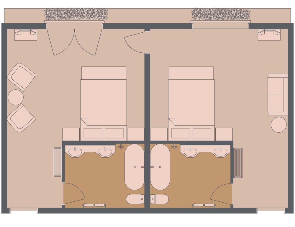 Diese symmetrisch aneinander grenzenden Pariser Hotelzimmer sind beide ähnlich eingerichtet. Jedes von ihnen hat ein Doppelbett mit zwei Nachttischen und Zierlampen. Eines der Zimmer verfügt über einen Sessel mit Tisch, das andere über zwei Sessel mit Tisch. Beide Zimmer sind mit dekorativen Waschtischen und Fenstern mit Blumenkästen ausgestattet, die den Eindruck von Paris im Frühling vermitteln. Die Bäder haben jeweils zwei Waschbecken, Badewannen mit Klauenfüßen und Toiletten. Eines der Zimmer ist in Blau- und Weißtönen gehalten, das andere in Pfirsich-, Gold- und Weißtönen. Die Polstermöbel im Retrostil und die hellen, gemusterten Tapeten verleihen diesen Zimmern ein schickes, altmodisches Aussehen, während die zeitgenössischen Kunstwerke für einen modernen Touch sorgen. Ihre Gäste werden das helle, luftige Ambiente und die charmante, antike Einrichtung lieben.
