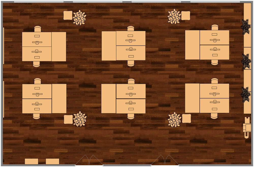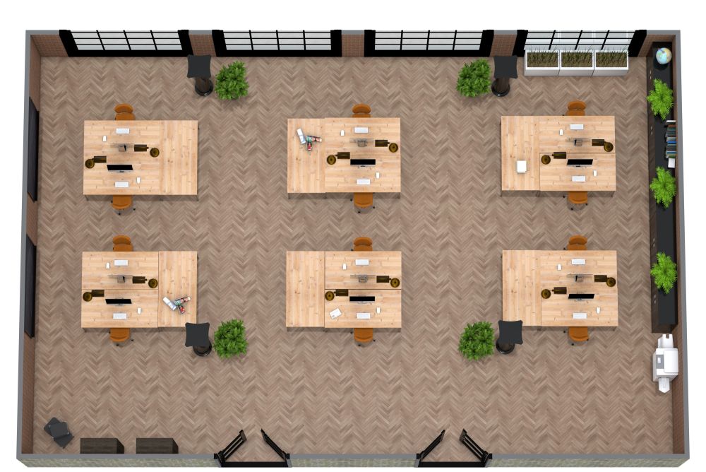 Sie werden vergessen, dass Sie auf der Arbeit sind, wenn Sie dieses auffällige Bürogebäude Grundriss betreten. Der große Raum ist geräumig, hell und einladend mit atemberaubendem Holzfußboden, hellbraunen Wänden und schickem schwarzem Zierrat. Vier übergroße Fenster säumen eine Wand des Büros und setzen einen schönen Akzent, während sie den Raum mit viel natürlichem Licht erhellen. An einer Wand neben den Fenstern steht ein langer Konsolentisch, der Stauraum bietet, während auf der anderen Seite zwei große Projektionsflächen zu finden sind. An der Wand gegenüber den Fenstern befinden sich zwei Doppeltüren. Der Grundriss des Bürogebäudes umfasst auch sechs moderne Schreibtische aus Naturholz, die jeweils groß genug sind, um zwei Arbeitsplätze zu beherbergen. Die Schreibtische sind jeweils mit zwei stilvollen braunen Leder-Bürostühlen kombiniert. Eine Vielzahl von Grünpflanzen, die um den Büroraum verstreut sind, verleihen ihm eine warme, einladende Atmosphäre.