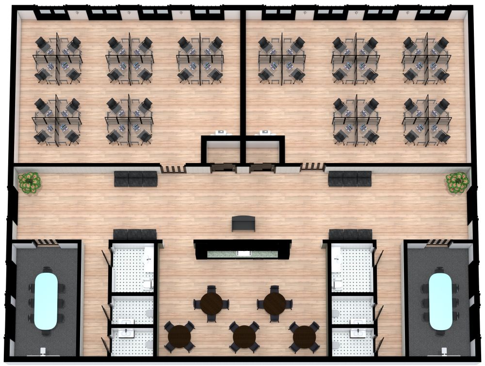 Wenn Sie ein traditionelles, langweiliges Büro durch ein modernes und inspirierendes ersetzen möchten, ist dieses moderne Bürolayout genau das Richtige für Sie. Auf einer Seite des Grundrisses befinden sich zwei geräumige Arbeitsbereiche. Jeder dieser Räume ist geräumig genug, um zwanzig Kabinen, aufgeteilt in Vierergruppen, unterzubringen. Die Kabinen sind mit schicken Glastischen und einfachen schwarzen Drehstühlen ausgestattet. Vier Fenster säumen die Wände jedes dieser Arbeitsräume, und helle Hartholzböden verleihen der Einrichtung eine helle, luftige Atmosphäre. Zwei Konferenzräume befinden sich in den gegenüberliegenden Ecken dieser Kabinenanordnung und sind mit einem ovalen Tisch in Petrol, acht schwarzen Stühlen und zwei Projektionsflächen ausgestattet. Ein geräumiger Flur zwischen den Kabinen- und Konferenzräumen führt zu einem offenen Raum mit fünf runden Tischen, die jeweils mit vier Stühlen bestückt sind. Die Kabinenanordnung umfasst außerdem sechs separate Toiletten, darunter zwei behindertengerechte Toiletten.