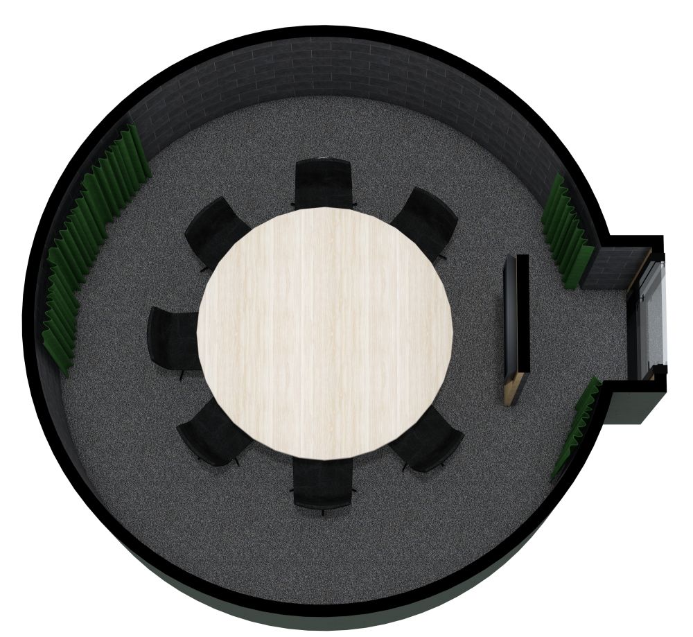 Wenn Sie eine Besprechung in einem sehr privaten Raum abhalten möchten, in dem Sie nicht gestört werden, dann ist dieses Layout für einen kleinen Konferenzraum genau das Richtige für Sie.Der Raum hat die Form eines Kreises mit einer Tür.Er hat einen dunkelgrauen Teppich und passende Wände sowie dunkelgrüne Vorhänge, die jegliches Licht von der Tür oder den Fenstern abhalten.In der Mitte des Raums steht ein runder Tisch mit einer Tischplatte aus blondem Holz, um den herum sieben bequeme schwarze Stühle stehen.An einer Seite des Raums steht ein großer LED-Bildschirm, falls Sie eine Präsentation halten oder Ihren Kunden ein Video zeigen wollen.Ein runder Konferenztisch zeigt, dass alle Teilnehmer gleichberechtigt sind und ihre Ansichten einbringen können.Die Abgeschiedenheit des Raums fördert die Konzentration und den Fokus.