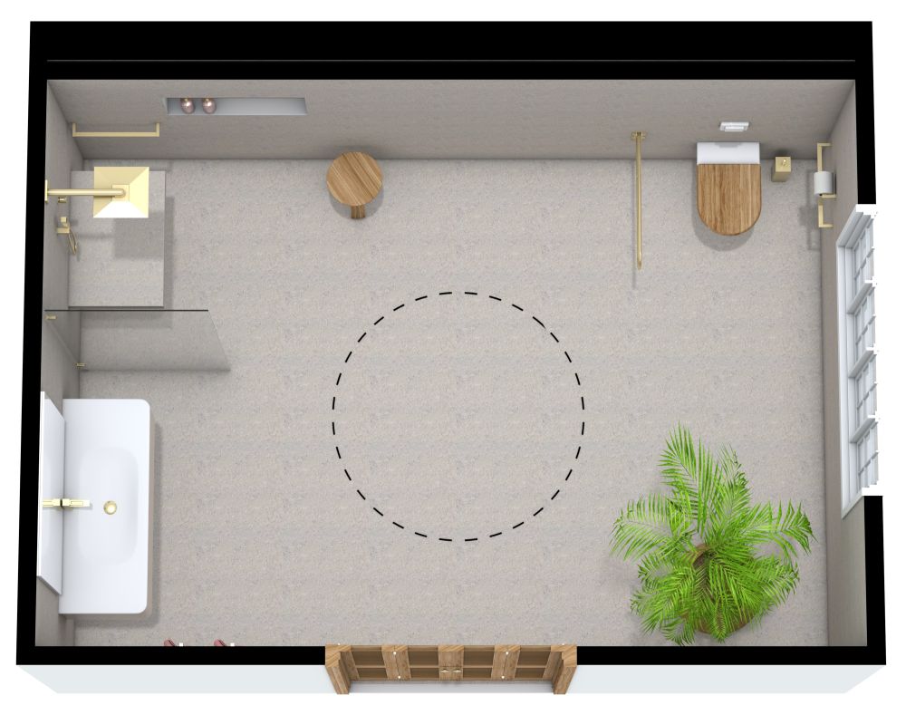 Schlicht und unaufdringlich, aber dennoch stilvoll und zeitgemäß: Dieses barrierefreie Badezimmer hat vielleicht nicht viel Schnickschnack, aber es hat es in sich, was die Optik angeht. Der geräumige Raum bietet reichlich Platz, um von einem Bereich des Badezimmers zum nächsten zu gelangen. Die Toilette befindet sich in einer Ecke des Raumes und ist mit einem Sicherheitsbügel ausgestattet, der sich direkt daneben befindet. Die Dusche befindet sich in der gegenüberliegenden Ecke und hat auf der einen Seite eine Glaswand und auf der anderen Seite einen offenen Bereich, in den man leicht ein- und aussteigen kann.Neben der Dusche befindet sich ein schlichtes weißes Waschbecken mit einem Spiegel darüber. Goldfarbene Beschläge finden sich überall in diesem barrierefreien Bad und verleihen ihm eine moderne, schicke Ausstrahlung. Gegenüber dem Waschbecken und der Dusche befinden sich vier weiß getäfelte Fenster, die viel natürliches Licht hereinlassen. Eine begrünte Palme verleiht der kahlen Ecke einen einladenden Touch.
