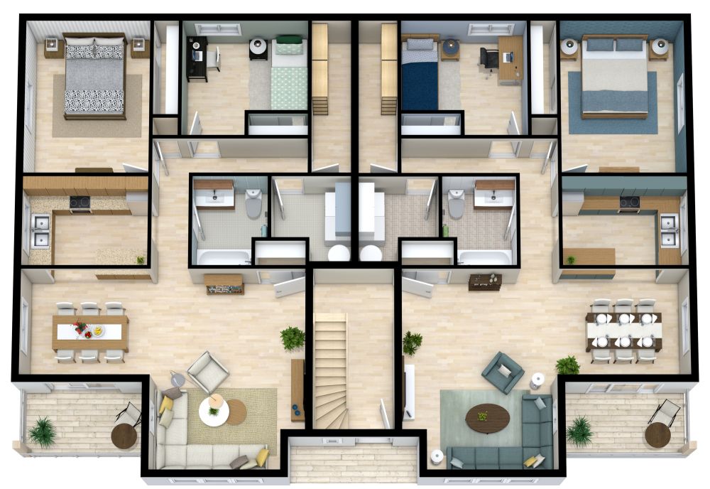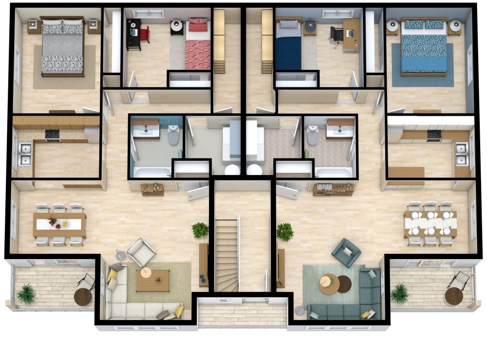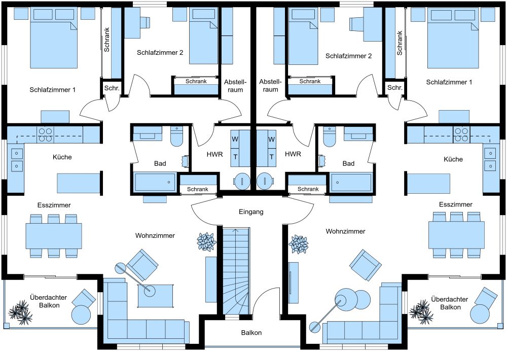 Die Suche nach einem clever geplanten zweistöckigen Vierfamilienhaus hat ein Ende. Jede Etage bietet zwei vollständige Wohnungen mit großzügigem Wohnbereich, zwei Schlafzimmern, Bad, Hauswirtschafts- bzw. Waschraum und Terrasse oder Balkon. Alle vier Wohnungen sind spiegelbildlich angelegt. Vom Eingangsbereich aus gelangen Sie zu den beiden Wohnungen im Erdgeschoss, während eine Treppe zu den Wohneinheiten im Obergeschoss führt. Hinter der Wohnungstür öffnet sich ein großzügiger Wohn- und Essbereich. Auf der einen Seite befindet sich die Küche mit viel Arbeitsfläche, Stauraum und Doppelspüle, auf der anderen ein gemütlicher Sitzbereich mit Erkerfenster. Ein großer Fensterbereich hellt den Essplatz zusätzlich auf. Eine Kochinsel oder Frühstückstheke trennt Küche und Essbereich. Bad und Hauswirtschaftsraum liegen direkt neben der Küche und bilden einen Flur, der Wohnbereich und Schlafzimmer voneinander trennt.