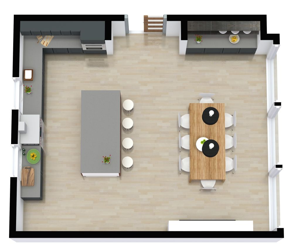 Diese stilvolle L-förmige Küche mit Insel verfügt über reichlich Stauraum am Fuß der Insel. Sowohl an der Vorderseite als auch an den Seiten der Kochinsel befinden sich Schränke. Sie hat eine kleine Ecke oder einen Überhang, in dem Sie die Sitzgelegenheiten verstauen können, wenn sie nicht gebraucht werden. Mit diesem Design wird der zusätzliche Arbeits-, Ess- und Stauraum, den sie bietet, maximiert. Die Marmorplatte der Kücheninsel hat an allen Seiten einen Überhang, sodass man an jeder Seite essen kann. Die Kücheninsel verfügt über zusätzliche Schränke, die die gesamte Basis auf allen Seiten abdecken.