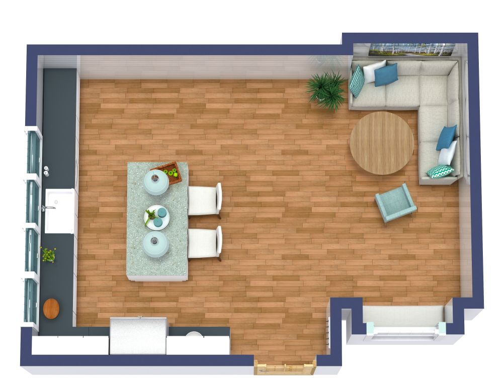 Wenn man eine Küche, einen Essbereich und einen Wohnbereich im selben Raum hat, kann es schwierig sein, Platz übrig zu haben. Doch das gelingt dieser Grundriss für eine L-förmige Küche mit Insel hervorragend, denn sie ist nicht nur geräumig, sondern verfügt auch über viel Arbeitsfläche, mehrere Schränke, einem Herd mit Wandkamin sowie eine Spüle. Gegenüber der Theke befindet sich die Kochinsel, die sowohl für die Zubereitung von Speisen als auch für das Essen frisch zubereiteter Mahlzeiten genutzt werden kann. Als Ergänzung zur L-förmigen Küche können Sie in der gegenüberliegenden Ecke eine L-förmige Sitzecke einrichten, die Platz für fünf Personen bietet. Die vier Fenster mit Blick auf die Küchentheke erhellen den Raum und lassen diesen geräumig wirken. Gegenüber des Wohnbereiches befindet sich ein weiteres Fenster mit einem überdachten Sims. Insgesamt ist dieser Grundriss nicht nur funktionell und praktisch, sondern auch sehr geräumig.