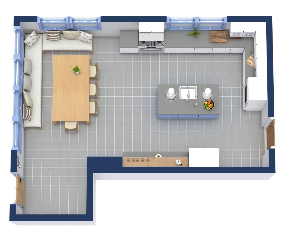 Dieser sonnige und helle Grundriss für eine Küche mit Frühstücksecke bietet viel Platz, um Ihre Lieblingsgerichte zuzubereiten und sich zum Genießen hinzusetzen. In der Ecke der Küche befindet sich eine gemütliche Sitzecke mit eingebauten Bänken, die Platz für bis zu zehn Personen bietet. In der Mitte der Küche befindet sich eine Kochinsel mit glatten Arbeitsflächen für die Zubereitung von Mahlzeiten und einer praktischen Spüle, die von einer modernen Hängeleuchte beleuchtet wird. Die umlaufenden Arbeitsflächen bieten Platz für einen Herd. Zudem können Sie in den Küchenschränken über den Arbeitsflächen Ihr gesamtes Geschirr und Ihre Kochutensilien unterbringen. Auf der gegenüberliegenden Seite befindet sich ein großer Kühlschrank und noch mehr Arbeitsfläche für einen Barbereich oder eine Kaffeestation. Gemeinsam kochen, speisen und unterhalten, während Sie das natürliche Sonnenlicht genießen, das durch die sorgfältig platzierten Fenster einfällt.