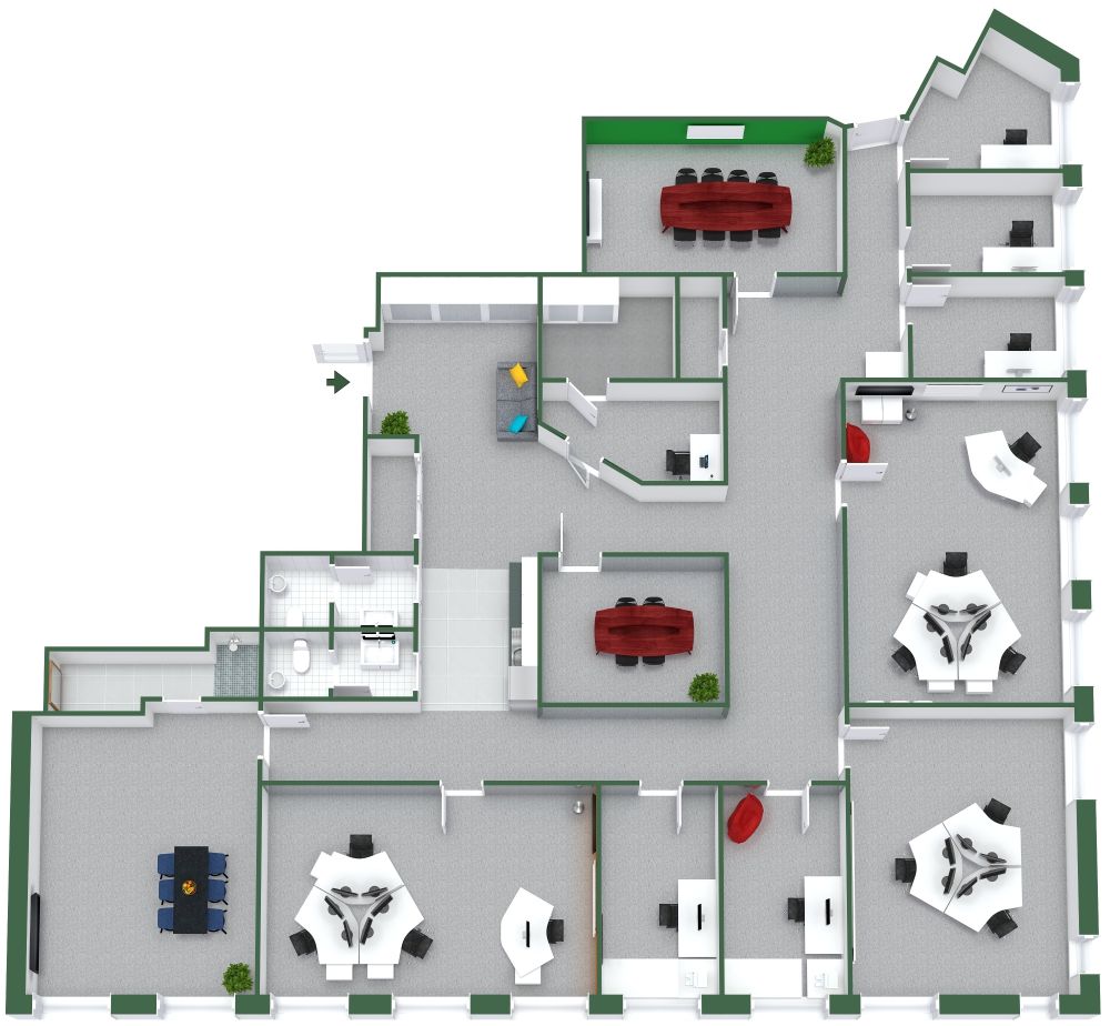 In dieser Bürodesign-Idee für Kleinunternehmen wird das Führen von Geschäften zum Vergnügen. Im Eingangsbereich finden Sie einen kleinen Empfangsbereich mit einem gemütlichen Sessel. Der schmale Flur führt zu einer Vielzahl von Büroräumen, darunter sechs kleine private Arbeitsbereiche und drei größere Räume mit vier beweglichen Schreibtischen und Stühlen. Drei geräumige Konferenzräume befinden sich ebenfalls auf beiden Seiten des Flurs. Zwei Bäder mit hellen, weißen Fliesen und passenden Geräten sowie ein Duschbereich befinden sich im Raum. Ein kleiner Küchenbereich befindet sich in der Mitte des Grundrisses. Das Büro verfügt über hellgraue Teppichböden, hellgrüne Akzentwände und lebhaftes Mobiliar, wie zum Beispiel leuchtend rote Tische in den Konferenzräumen.
