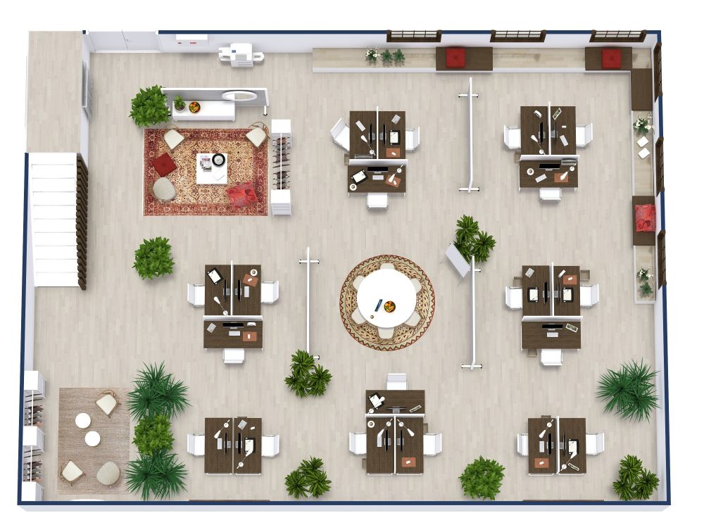 Vier Trennwände und vereinzelte Topfpflanzen unterteilen diesen Grundriss für ein geräumiges, offenes Büro in verschiedene Bereiche. Auf diese Weise erhalten die Mitarbeiter etwas Privatsphäre, um sich besser konzentrieren zu können, aber Sie behalten trotzdem das großzügige Gefühl eines Großraumbüros. Es gibt sechs rechteckige Tische mit je drei Arbeitsplätzen und einen weiteren mit zwei Arbeitsplätzen. In der Mitte des Grundrisses befindet sich ein runder Tisch, der für Konferenzen oder für die gemeinsame Arbeit an Projekten genutzt werden kann. In zwei Ecken des Grundrisses befinden sich zwei Loungebereiche mit bequemen Stühlen, Kissen, Teppichen und Kleiderbügeln. Außerdem gibt es vier gepolsterte Fensterplätze, die sich hervorragend eignen, wenn ein Mitarbeiter sich für ein paar Minuten von seinem Schreibtisch entfernen möchte. Die Hartholzböden, die dunkelbraunen Schreibtische, die farbenfrohen Teppiche und die Pflanzen verleihen dem Raum ein erdiges Gefühl.