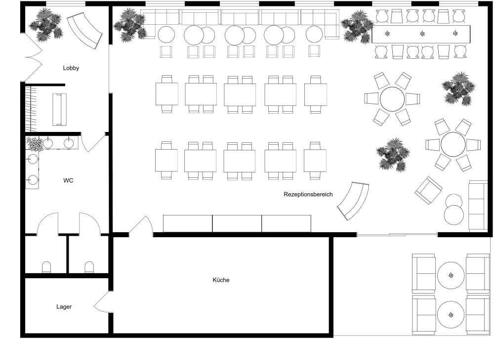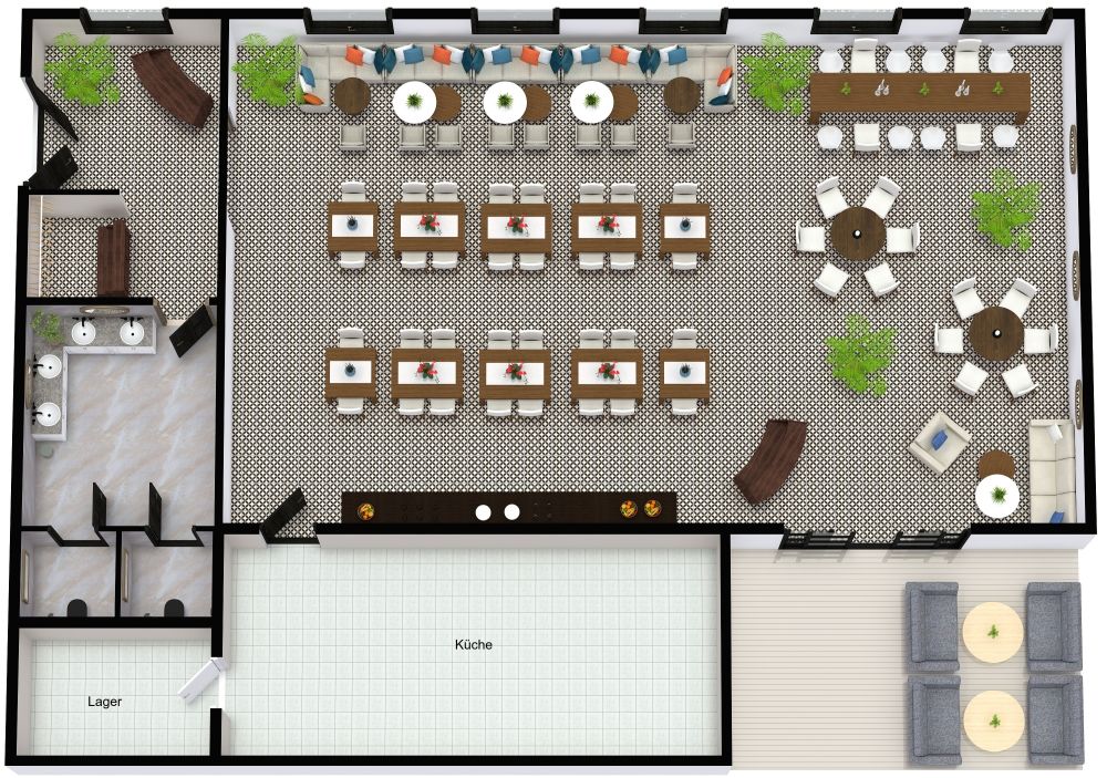 Manchmal sind es die einfachsten Cafés, die den besten Eindruck auf treue Stammkunden und Erstbesucher machen. Dieser Grundriss für ein klassisches und stilvolles Café beweist, dass ein Raum nicht mit einer Vielzahl von Accessoires oder übertriebenem Dekor ausgestattet sein muss, um besonders zu wirken. Der Essbereich im Innenbereich ist mit einfachen quadratischen Holztischen und strahlend weißen Wänden ausgestattet. Hinzu kommen weiche blaue Wildleder-Stühle und ein weiß getünchter Fußboden. Die Ästhetik der Inneneinrichtung setzt sich im Außenbereich mit passenden Tischen und Stühlen fort. Der Barista-Bereich besteht aus einer langen schwarzen Arbeitsplatte und einer zweiten weißen Arbeitsplatte. Hinter dem Barbereich befindet sich ein großzügiger Stauraum. Das schicke Badezimmer verfügt über zwei geräumige Kabinen mit Waschtischen innerhalb und außerhalb der Kabinen. Wenn Sie auf der Suche nach einem Café sind, das mühelos stilvoll und komfortabel ist, sind Sie hier genau richtig.