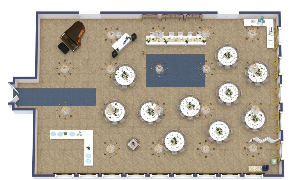 Mit einem weitläufigen Grundriss und Designer-Details ermöglicht Ihnen diese Layout-Idee für eine klassische Hochzeitslocation, die Party des Jahres zu feiern. Treten Sie durch die Eingangstür, die durch einen langen, schmalen Läufer hervorgehoben wird, in den gut ausgestatteten Speisesaal mit wunderschönen, hängenden Kronleuchtern. Auf der linken Seite finden Sie Platz für eine Bar oder einen Buffettisch und zusätzlich ist im gesamten Saal ausreichend Platz für mindestens zehn runde Tische sowie einen langen, schmalen Haupttisch für die Hochzeitsgesellschaft. Hinter dem Kopfende des Tisches lässt eine Spiegelwand den Raum noch weitläufiger erscheinen. In der Mitte des Raums befindet sich die Tanzfläche. Durch die vielen Fenster an den Seitenwänden fällt natürliches Licht in den Raum. Besonders wenn die Sonne untergeht, tragen die kunstvollen Hängelampen zur Stimmung und zum Ambiente bei. Es gibt genügend Platz für eine Band, einen DJ und sogar einen Photobooth.