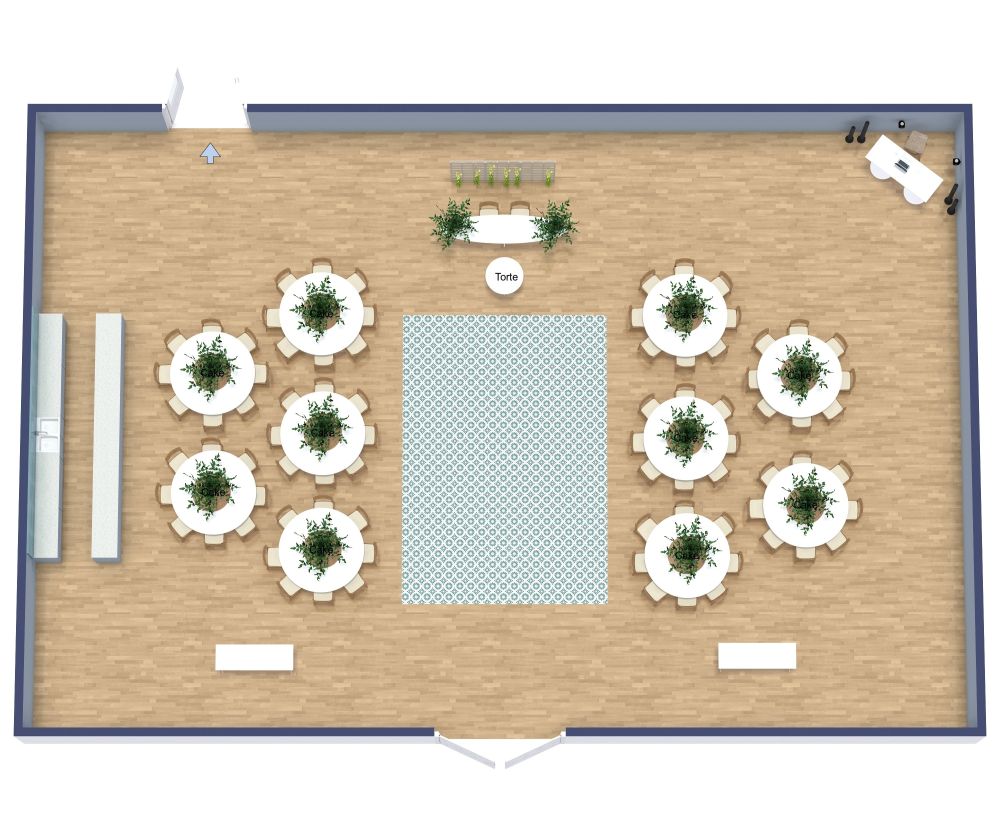 Dieser Grundriss für eine Hochzeitslocation mit Bar und Tanzfläche wirkt elegant und ist in Weiß- und Cremetönen, natürlichen Holztönen und Grüntönen gehalten. Es gibt einen Sweetheart-Tisch für das Brautpaar mit einem Spalier dahinter und der Hochzeitstorte davor. Vor der Hochzeitstorte befindet sich die Tanzfläche, die das weiß-grüne Thema des Abends fortsetzt. Auf jeder Seite der Tanzfläche stehen fünf runde Tische, an denen jeweils acht Gäste Platz finden. In einer Ecke ist außerdem Platz für den Plattenspieler des DJs und an einer Wand ist eine Bar aufgebaut. Es gibt zwei kleinere Tische, von denen einer für die Geschenke und der andere für die Tischkarten verwendet werden kann. Grüne Blumensträuße auf den Tischen können dazu beitragen, eine festliche Atmosphäre an Ihrem besonderen Tag zu schaffen.