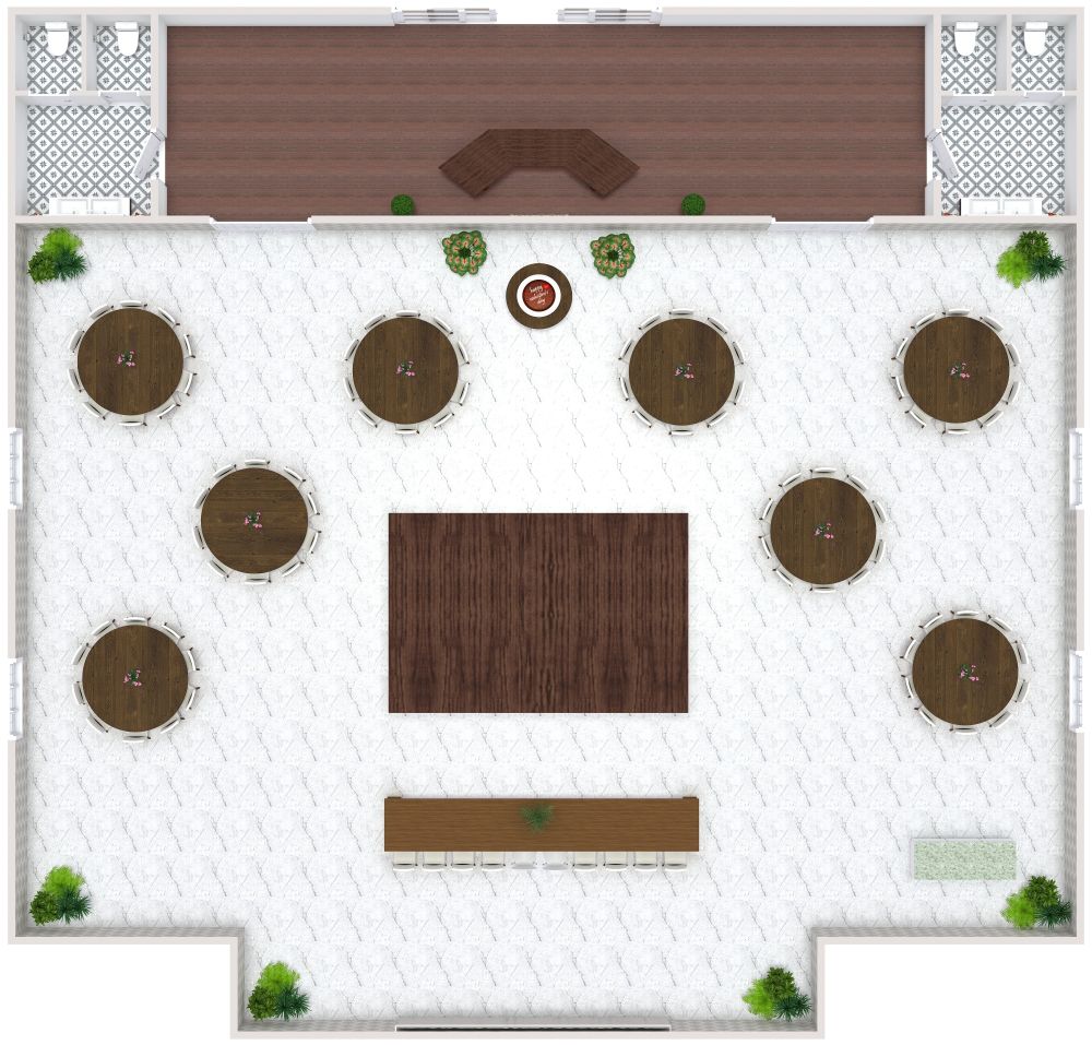 Es gibt nichts Besseres als eine Tanzfläche, um die Stimmung auf einer Hochzeit zu steigern. Bei dieser Tischordnung für eine Hochzeitslocation befindet sich die Tanzfläche genau in der Mitte, was die Gäste dazu anregt, die Nacht durchzutanzen. Außerdem gibt es einen langen Tisch mit zehn Stühlen für die Hochzeitsgesellschaft, sowie acht runde Tische mit jeweils zehn Stühlen, die um die Tanzfläche herum angeordnet sind. In einer Ecke befindet sich eine Bar. Die Hochzeitstorte kann direkt zwischen den beiden Eingängen des Raums platziert werden. Am Eingang befindet sich ein Empfangsbereich, in dem die Gäste begrüßt und zu ihren Plätzen geführt werden. Auf jeder Seite dieses Bereichs gibt es eine Toilette, eine für Männer und eine für Frauen. Insgesamt ist dies ein großartiger Veranstaltungsort für Hochzeiten, perfekt für einen Empfang mit Abendessen und Tanz.