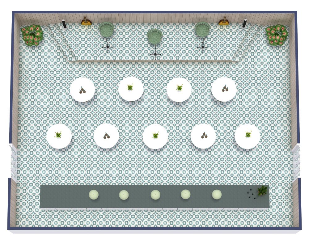 Genießen Sie das einzigartige Vergnügen, Live-Musik in diesem Konzertgrundriss mit Bühne, Stehbereich und Bar zu hören. Dieser geräumige Grundriss wird durch einen hellen Fliesenboden und holzvertäfelte Wände zum Leben erweckt. An der hinteren Wand des Raums befindet sich eine erhöhte Bühne für Auftritte, die ausgerichtet ist auf einen Bereich mit Hochtischen, an denen Sie Ihr Getränk abstellen können, während Sie die Show genießen. Die Tische sind so angeordnet, dass genügend Stehplätze zur Verfügung stehen, und an der hinteren Wand des Raums befindet sich eine lange, schmale Bar, an der während der Vorstellung Getränke serviert werden. Zwei Fenster auf beiden Seiten der hinteren Bar sorgen tagsüber für natürliches Licht und für ein dunkleres Ambiente bei Abendshows.