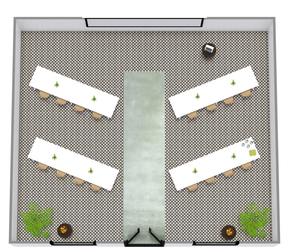 Treten Sie durch die Doppeltüren an der Rückseite dieses Grundrisses für einen Konferenzraum im V-förmigen Stil ein und finden Sie einen hellen sowie vielseitigen Raum zum Zusammenkommen und Lernen vor. Eine fröhlich gemusterte Fliese bildet die Bühne, während ein langer Mittelgang die Sitzordnung auf der rechten und linken Seite trennt. An der Vorderseite des Raums steht ein Rednerpodium für Gespräche und Vorträge zur Verfügung, während eine Projektor-Leinwand die Möglichkeit einer visuellen Komponente bietet. Die Tagungsgäste können bequem an vier langen, schmalen Konferenztischen Platz nehmen, so dass sie während der Präsentation Notizen machen können. Im hinteren Teil des Raums stehen Beistelltische für Getränke und Erfrischungen in den Pausen zur Verfügung. Zudem gibt es viel Platz für Pflanzen und Grünzeug, um den Raum zu verschönern.