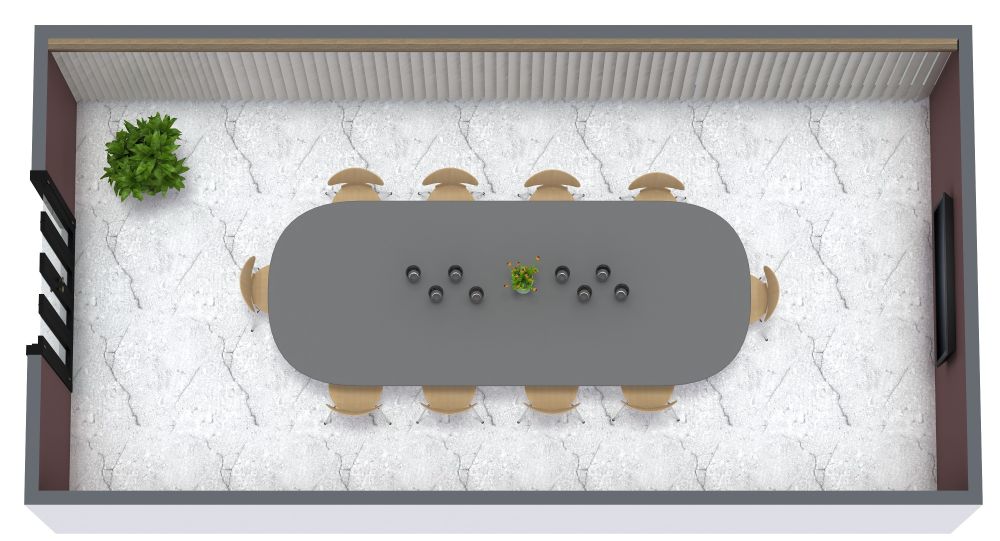 Entdecken Sie den idealen Ort, um sich zu versammeln und Ideen auszutauschen - der Grundriss für einen Konferenzraum mit Sitzungssaalstil. Der edle Marmorfußboden verleiht dem Raum ein gehobenes Ambiente, während die getäfelten Wände für Privatsphäre sorgen, indem sie den Raum von Lärm und Störungen von außen isolieren. In der Mitte des Raumes befindet sich ein großer, dunkelgrauer Konferenztisch mit viel Platz für bis zu zehn Personen. Dunkle, naturfarbene Wände machen diesen Raum gemütlich und warm, während ein großes Fenster an der Seitenwand für reichlich natürliches Sonnenlicht sorgt. Der geräumige Grundriss bietet viel Platz, um sich in den Pausen zu bewegen und sich zu unterhalten. In der Nähe des Fensters gibt es zusätzlichen Platz für dekorative Grünpflanzen. Treffen Sie sich mit Ihrem Kollegium in diesem eleganten, anspruchsvollen Konferenzraum.