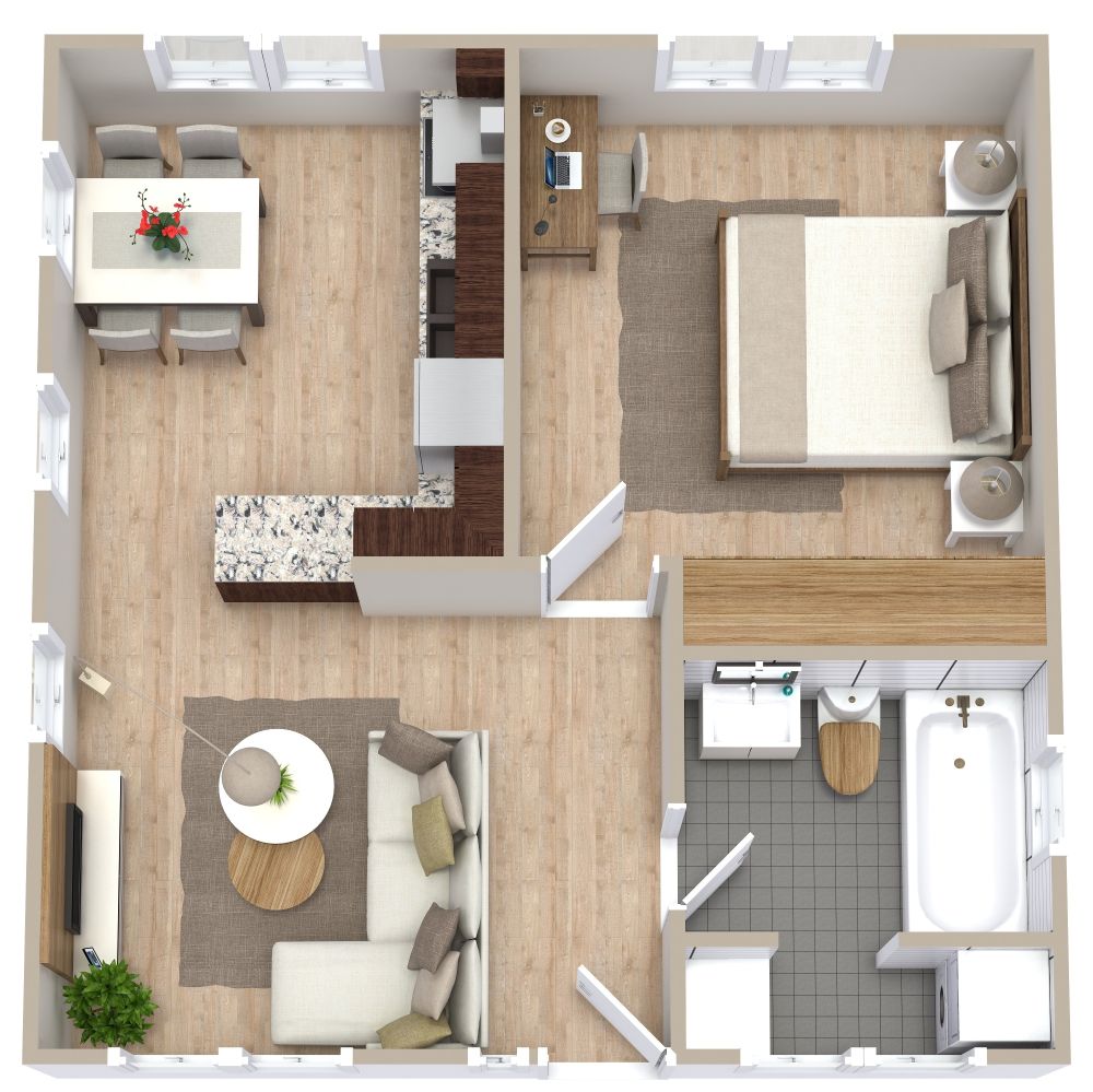 Erkunden Sie diesen einzigartigen Grundriss für ein kleines Haus mit Bad, welcher insbesondere durch seine praktische Waschküche besticht. Vom einladenden Eingangsbereich aus, betreten Sie das behagliche Wohnzimmer, dessen Dimensionen ideal für ein Sofa, einen Couchtisch und eine Entertainment-Ecke bemessen sind. Zahlreiche Fenster durchfluten den Raum mit natürlichem Licht und schaffen eine warme, freundliche Atmosphäre. Angrenzend präsentiert sich der kombinierte Küchen- und Essbereich, ausgestattet mit einem vollwertigen Herd, einer Doppelspüle, einem großzügigen Kühlschrank sowie reichlichem Stauraum oben und unten. Die Küchenhalbinsel bietet viel Arbeitsfläche für die kulinarische Zubereitung oder das Anrichten von Buffets und Party-Snacks. Ein komfortabler Esstisch mit Platz für vier Personen ergänzt diesen Bereich harmonisch. Das Badezimmer punktet mit einem Waschbecken, einer Toilette und einer kombinierten Badewannen-/Duscheinheit sowie einer speziellen Wäschenische, die eine Waschmaschine, einen Trockner, einen Faltbereich und Aufbewahrung für Reinigungsmittel bereithält. Das Schlafzimmer bietet ausreichend Raum für ein Kingsize-Bett und verfügt zusätzlich über einen Einbauschrank sowie Platz für einen Schreibtisch oder eine Kommode.