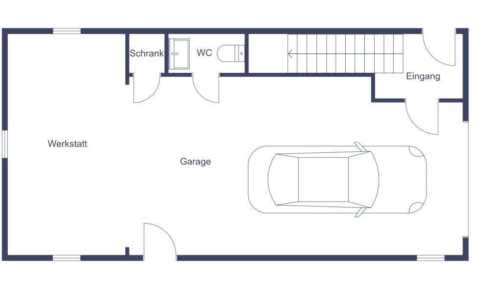 Betrachten Sie diesen Grundriss für eine 3-Zimmer-Garagenwohnung mit Balkon. Die multifunktionale Garage ist nicht nur für ein Auto konzipiert, sondern auch mit Regalen und genügend Raum für eine Werkstatt, ein Büro, ein nützliches Badezimmer und einen Stauraum ausgestattet. Über das Eingangsfoyer und eine Treppe gelangen Sie in die Wohnung mit drei Zimmern. Hier empfängt Sie ein lichterfüllter Wohn- und Essbereich, von dem aus Sie Zugang zu einem großzügigen Balkon oder einer Terrasse haben. Direkt angrenzend finden Sie eine effizient gestaltete Galeerenküche mit Kühlschrank, Herd, Spüle, weitläufigen Arbeitsplatten und praktischen Hängeschränken. Die beiden nahezu gleich großen Schlafzimmer sind mit Einbauschränken und mehreren Fenstern ausgestattet, die einen herrlichen Ausblick bieten. Diese Zimmer teilen sich ein komfortables Badezimmer mit Waschbecken, WC und einer kombinierten Badewanne/Dusche.