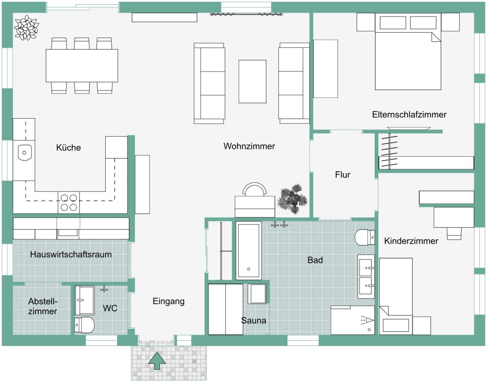 Lassen Sie sich von den beeindruckenden Features dieses stilvollen Layout für eine 3-Zimmer-Wohnung mit großem Bad begeistern. Schon beim Betreten werden Sie von einem praktischen Badezimmer und einem Garderobenschrank empfangen, ergänzt durch einen separaten Hauswirtschaftsraum. Die U-förmige Küche überzeugt mit Ausstattungen wie einem Kühlschrank, einem Herd und einer Spüle – alles, was Sie zum Kochen brauchen.Der offen konzipierte Wohn- und Essbereich strahlt Großzügigkeit und Komfort aus. Hier finden Sie ausreichend Platz für eine einladende Wohnlandschaft, einen ausgedehnten Esstisch und, je nach Vorliebe, einen Schreibtisch, ein Klavier oder ein Entertainment-System. Das geräumige Hauptschlafzimmer punktet nicht nur mit einem begehbaren Kleiderschrank, sondern bietet auch genug Platz für ein Queen- oder Kingsize-Bett. Ein zweites, etwas kompakteres Schlafzimmer kann vielfältig genutzt werden, sei es als Kinderzimmer, Gästezimmer oder auch als Büro- oder Bastelraum. Doch das wahre Highlight dieses Grundrisses ist das luxuriöse Badezimmer: Es begeistert mit einem Doppelwaschbecken, einer Toilette, einer separaten Dusche und einer Badewanne. Und als besonderes Extra wartet hier sogar eine Sauna auf Sie!