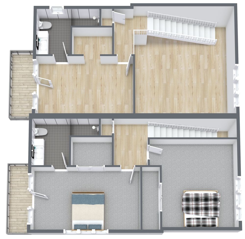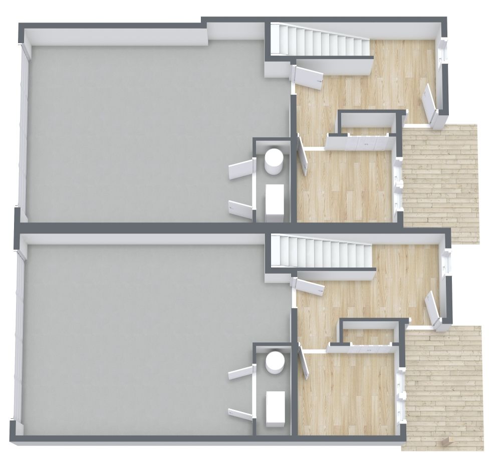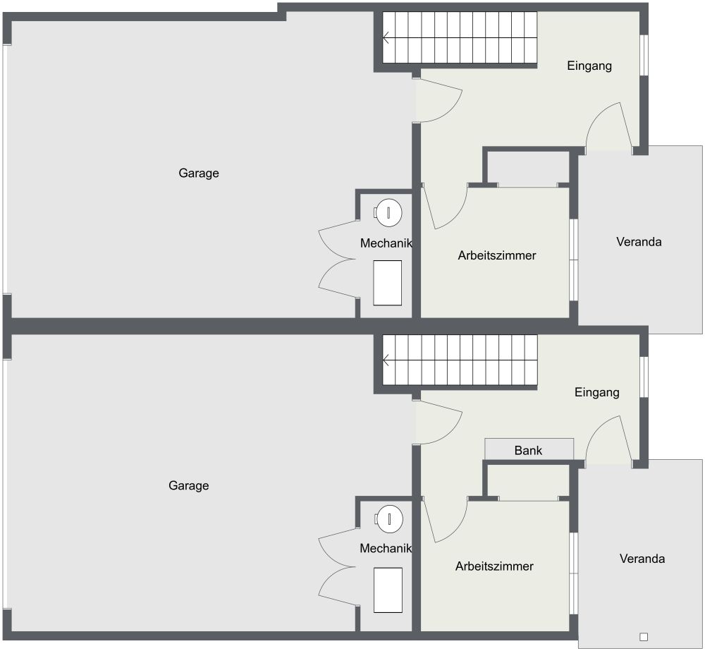Dieser Grundriss für ein 3-stöckiges Zweifamilienhaus zeigt verschiedene Layouts für die gleiche Grundfläche: Eine Einheit bietet ein Wohnzimmer mit hohen Decken und 2 Schlafzimmern, während die andere Einheit ein drittes Schlafzimmer über dem Wohnzimmer bietet. Das Erdgeschoss beider Doppelhaushälften ist exakt gleich gestaltet: Veranda, Eingangsbereich, Büro, Technikraum und Garage. Die mittlere Etage einer Einheit verfügt über eine Garderobe am oberen Ende der Treppe, eine geteilte Küche mit einer Speisekammer auf der anderen Seite des Flurs und einer geräumigen Kücheninsel. Das Wohnzimmer in diesem Grundriss hat hohe Decken, die bis zum Dach reichen. Auf der gleichen Ebene der anderen Haushälfte befindet sich am oberen Ende der Treppe eine Essecke, und die Garderobe und die Speisekammer sind näher an die Küche gerückt. Das Wohnzimmer hat eine normale Deckenhöhe. Im Obergeschoss bietet eine der Einheiten einen offenen Treppenabsatz mit Blick auf das darunter liegende Wohnzimmer und ein Hauptschlafzimmer mit einer privaten Terrasse, einem geräumigen begehbaren Kleiderschrank und einem eigenen Bad. Die andere Einheit bietet ein zusätzliches zweites Schlafzimmer oder ein optionales Büro auf dieser Etage.