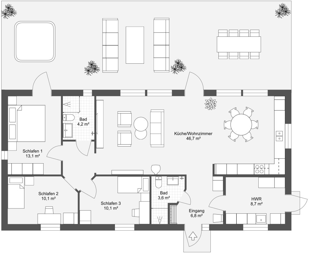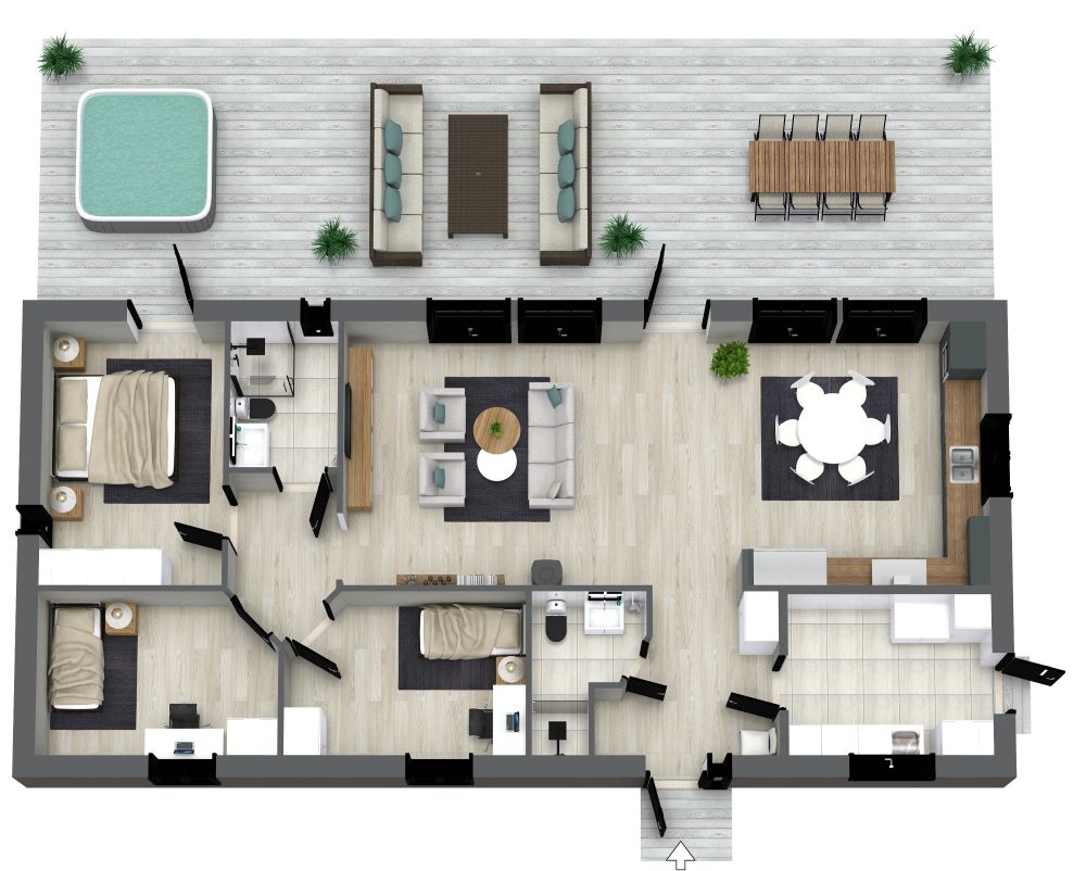 Erleben Sie mit diesem Gläntan 112 Grundrisse das Innen- und Außenleben vom Feinsten. Der vordere Eingang bietet praktische Ablagemöglichkeiten für Ihre Bedürfnisse. Auf der rechten Seite befindet sich ein separater Hauswirtschaftsraum mit Waschmaschine und Trockner, Waschbecken, Faltbereich und Wäscheschrank. Eine praktische Tür nach draußen erhöht die Funktionalität. Ebenfalls in der Nähe des Eingangs befindet sich ein großes Badezimmer mit Waschbecken, Toilette und kompakter Dusche sowie ein großer Raum, welcher über eine L-förmige Küche verfügt, die Sie mit Geräten Ihrer Wahl ausstatten können. Stellen Sie einen Esstisch in der Nähe der großen Fenster auf, um die Aussicht zu genießen. Durch eine Glastür gelangen Sie auf die weitläufige Terrasse – stellen Sie einen Esstisch, eine Möbelgruppe oder einen Whirlpool auf – Sie haben die Wahl. Die drei Schlafzimmer sind auf der linken Seite des Grundrisses gruppiert. Richten Sie das geräumige Hauptschlafzimmer mit einem großen Bett, Beistelltischen und mehreren Schränken ein. Eine Glastür bietet direkten Zugang zur hinteren Terrasse. Ein zweites größeres Badezimmer befindet sich in der Nähe der Schlafzimmer und enthält ein Waschbecken, eine Toilette und eine Dusche.