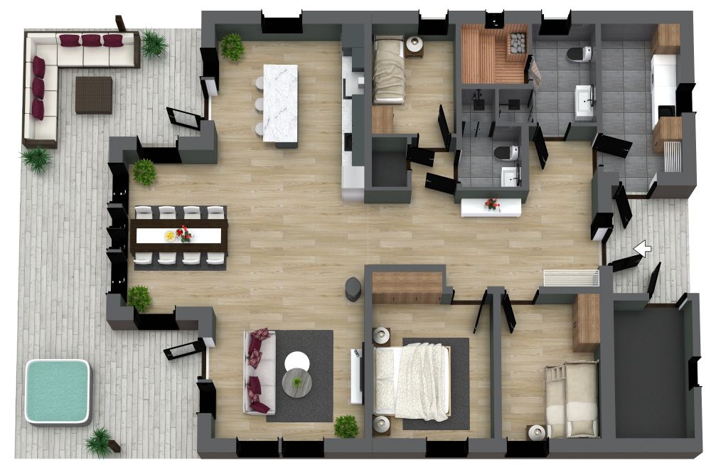 Erleben Sie die schöne Aussicht und das Leben im Innen- und Außenbereich mit dem funktionalen Harmoni 132 Grundrisse. Die vordere Veranda mit ihrer schönen Eingangstür und dem Fenster bietet auch Zugang zu einem großen Abstellraum, perfekt für Fahrräder, Werkzeuge oder alles, was Sie außerhalb des Hauptwohnbereichs aufbewahren möchten. Beachten Sie auch die praktische Eingangstür zur Waschküche. Perfekt für jeden, der das Haus mit schlammigen oder nassen Schuhen und Kleidern betreten möchte. Am Ende des Flurs befindet sich ein geräumiges großes Zimmer mit einem Kamin, großen Fenstern und Glastüren, die auf eine schöne Terrasse führen. Der Esstisch mit Fenstern auf drei Seiten bietet eine schöne Aussicht. Die große, einwandige Küche verfügt über eine Insel für zusätzlichen Stauraum, Vorbereitungsmöglichkeiten und eine Sitzgelegenheit an der Frühstücksbar. Abgerundet wird dieses Layout durch das große primäre Schlafzimmer und die zwei kleineren sekundären Schlafzimmer. Ein Badezimmer verfügt über ein Waschbecken, eine Toilette und eine Dusche, während das andere Badezimmer sogar mit einer Sauna oder einem Dampfbad ausgestattet ist.