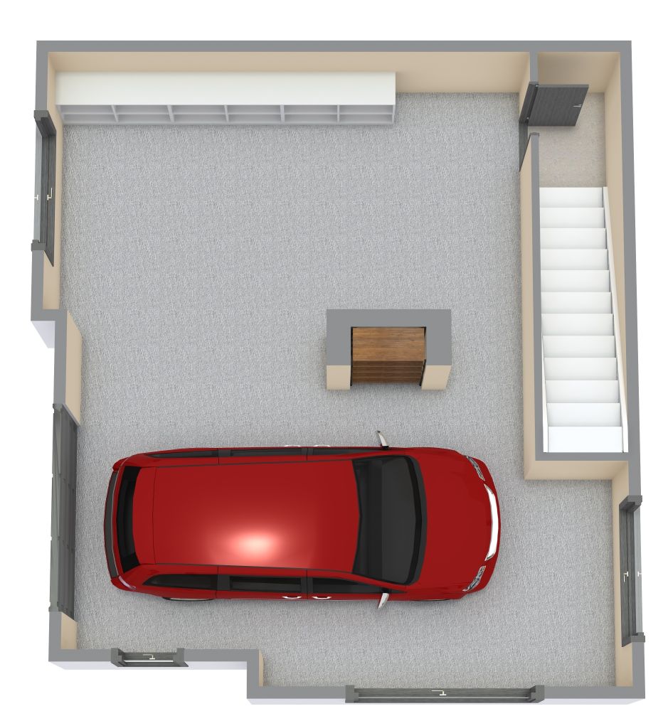 Ein Hauch von hellem Gelb belebt die ansonsten neutrale Farbpalette dieser Grundriss für eine Garagenwohnung mit Kamin. Im Erdgeschoss befindet sich eine Garage, in der Sie Ihr Auto abstellen und zusätzliche Gegenstände unterbringen können. Im Obergeschoss befindet sich eine gemütliche Zweizimmer-Wohnung. Das Schlafzimmer ist mit einem Doppelbett, zwei Nachttischen und einem Einbauschrank ausgestattet. Neben dem Schlafzimmer befindet sich ein Badezimmer mit einer Badewanne, einem Waschbecken und einer Toilette. In einer Ecke befindet sich eine offene Küche mit einer L-förmigen Theke und einer Insel. Der Herd befindet sich auf der Insel, so dass Sie bei der Zubereitung Ihrer Mahlzeit den Blick auf das Wohnzimmer richten können. Außerdem gibt es eine Spüle und einen Kühlschrank sowie eine kleine Speisekammer. Der Wohnbereich verfügt über eine schöne gelbe Couch mit einem Couchtisch und einem Kamin gegenüber.