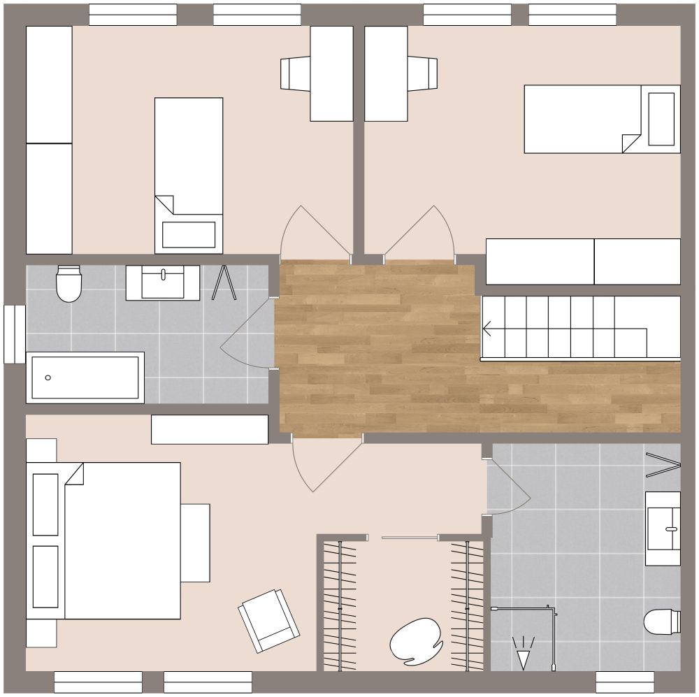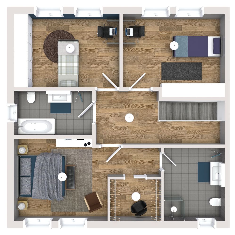 Ein Fitnessraum, ein überdachtes Carport und viele dunkelgraue Kontraste sind einige Highlights dieses Grundrisses im maskulinen Stil mit großer Terrasse. Im Eingangsbereich im Erdgeschoss befinden sich ein praktischer Kleiderschrank und eine Ablagefläche, ein Badezimmer und ein flexibler Raum, der derzeit als privater Fitnessraum genutzt wird. Wenn Sie den Raum nicht für sportliche Aktivitäten nutzen möchten, können Sie diesen ganz einfach als Büro, Werkstatt oder Gästezimmer einrichten. Das offene Wohnkonzept umfasst eine U-förmige Küche mit anpassbaren Geräten, einen großen Essbereich und ein gemütliches Wohnzimmer mit Fernseher. Zwei Glasschiebetüren führen durch das Esszimmer nach draußen, wo man im Freien essen kann. Im Obergeschoss befindet sich das große Hauptschlafzimmer mit einem begehbaren Kleiderschrank und einem geräumigen Badezimmer mit Waschbecken, Toilette und Dusche. Zwei weitere Schlafzimmer haben große Fenster, die für viel Licht sorgen, und teilen sich ein separates großes Bad.