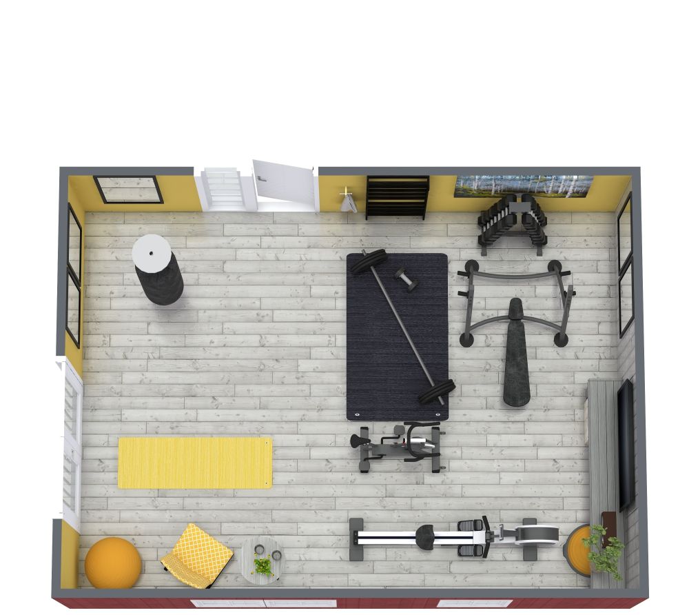 Sie können ein Fitnessraum mit gelben Akzentfarben einrichten, um eine sonnige Atmosphäre zu schaffen. Dieser Raum hat drei Sprossenfenster, ein Seitenfenster und eine Glastür, die für ausreichend Licht sorgen. Das gelbe Thema findet sich auch in dem Stabilitätsball, der Yogamatte und dem BOSU-Ball wieder. Ein gelber Sitz und ein gelber Tisch sorgen für Ruhepausen zwischen den Sätzen und verleihen dem Raum eine gemütliche Atmosphäre. Es gibt fünf Spiegel im Fitnessstudio, die den Raum vergrößern und den Trainierenden die Möglichkeit geben, ihre Form zu überprüfen. Der Fitnessraum hat Zugang zu einem Balkon, der sich perfekt für Yoga-Sitzungen im Freien eignet. Es gibt einen Boxsack, eine Bankpresse, feste Hanteln, ein vertikales Holzregal, ein Spinning-Rad und ein Rudergerät daneben. Zur Unterhaltung gibt es einen Fernseher und einen Lautsprecher. Unter dem TV-Ständer gibt es außerdem Stauraum und eine Pflanze für ein gesundes Workout.