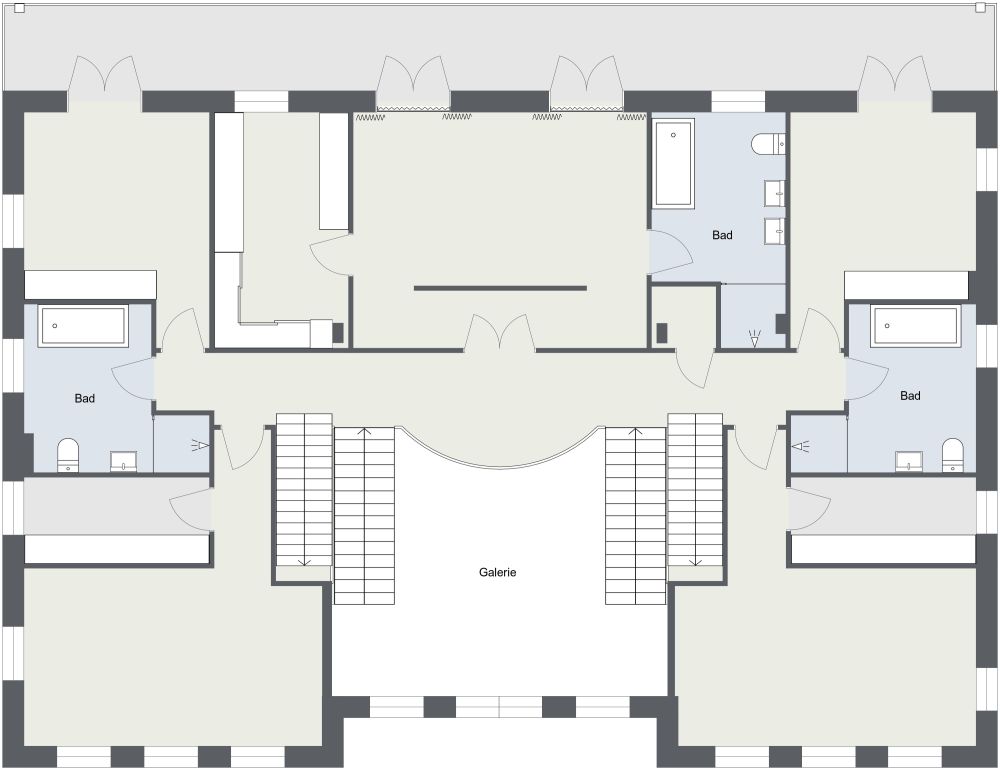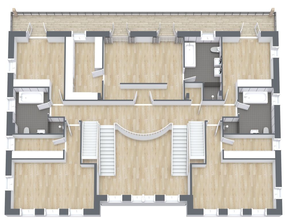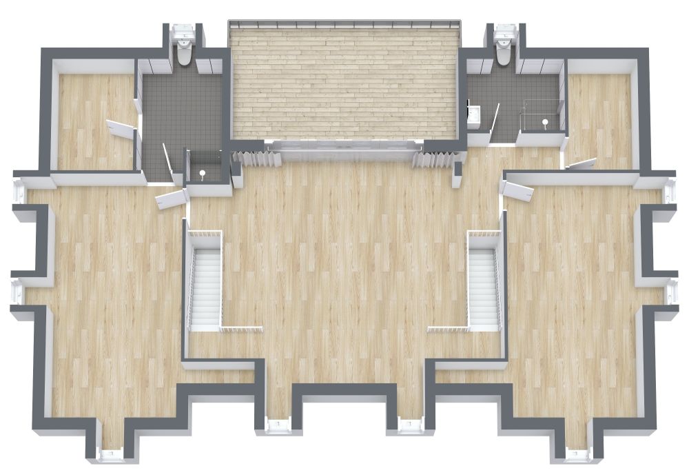 Wenn Sie eine große Familie haben oder oft Freunde zu Gast haben, dann werden Sie diesen Grundriss für ein 3-stöckiges großes Haus mit 8 Schlafzimmern lieben. Im ersten Stock gibt es einen Flur am Eingang, ein Wohnzimmer auf der linken Seite, ein zusätzliches Zimmer auf der rechten Seite, ein WC mit Toilette und Waschbecken und einen langen Essbereich mit Sideboards und einer Insel. Außerdem gibt es einen Technikraum, eine Garderobe und einen Hauswirtschaftsraum mit zwei langen Theken und zwei Waschbecken. Im zweiten Stock befinden sich zwei große Gästezimmer und zwei kleinere Schlafzimmer sowie zwei Bäder mit Duschen und Toiletten. Im dritten Stock gibt es zwei mittelgroße Schlafzimmer und zwei kleinere Schlafzimmer. Außerdem gibt es drei Bäder mit Wanne, Dusche, Toilette und Waschbecken. Es gibt eine quadratische Galerie, in der man Kunstwerke aufhängen kann, und einen Balkon, der sich über die gesamte Länge des Hauses erstreckt.