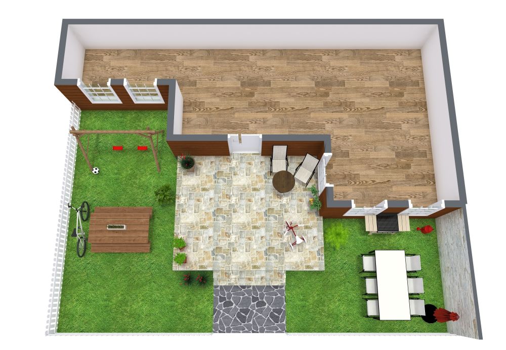 Bei dieser Grundrissidee für einen verspielten Vorgarten hat der Eingang zum Haus eine Zickzackmuster, die dazu genutzt werden kann, den Vorgarten in drei Bereiche zu unterteilen. Der Bereich vor dem Haupteingang ist mit einem Betonbelag in Steinoptik versehen. Er ist etwas höher gelegen als die Abschnitte zu beiden Seiten, die mit Rasen bepflanzt sind. In dem kleineren, mit Rasen bepflanzten Bereich stehen ein Esstisch mit sechs Stühlen und ein Grill, falls Sie Lust haben, ein wenig im Freien zu kochen. In dem Bereich mit dem Betonbelag stehen in einer Ecke zwei Liegestühle und ein Couchtisch. In dem anderen, etwas größeren Bereich mit Rasen befinden sich zwei Schaukeln für Kinder und ein Holztisch mit zwei Bänken, so dass eine Art Picknick-Atmosphäre entsteht. Auf der Betonfläche können die Kinder mit ihren Spielzeug-Treträdern fahren.
