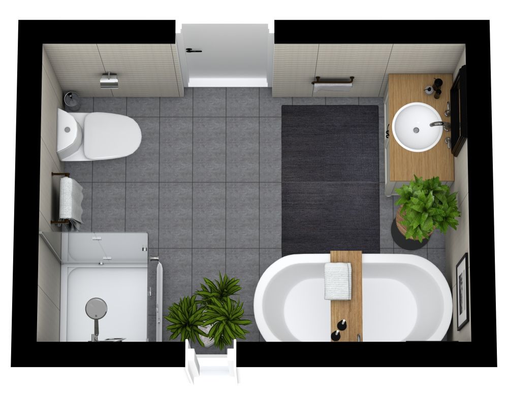 Dieser Grundriss für ein mittelgroßes, rechteckiges Badezimmer wirkt dezent und gleichzeitig elegant. Das Bad ist in verschiedenen Weiß- und Grautönen gehalten. Die Fliesen auf dem Boden sind in einem dunklen Grau mit einem Natursteinmuster, während die Fliesen an den Wänden in einem helleren Grau mit horizontalen Streifen gestaltet sind. Es gibt eine ovale, skulpturale Badewanne in Weiß mit einer hölzernen Wannenablage, auf der Sie eine Tasse Kaffee oder ein Buch abstellen können. In einer Ecke befindet sich auch eine Dusche, für die Tage, an denen man keine Zeit für ein langes Bad hat. In einer Ecke befindet sich eine Toilette und in einer anderen ein rundes Waschbecken. Das Holzdekor der Badewannenablage passt zum Holzdekor des Waschbeckens und verleiht dem Bad eine natürliche, elegante Ausstrahlung.