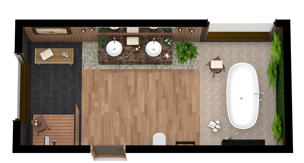 Machen Sie Urlaub zu Hause in diesem rechteckigen Badezimmer mit tropischem Dekor. Durch eine Schwingtür gelangt man in ein geräumiges, offenes Bad. Gegenüber dem Eingang befindet sich ein langer Waschtisch mit zwei Waschbecken. Eine große, freistehende Badewanne steht auf einer Seite des Raums im Mittelpunkt. Auf der anderen Seite erwartet Sie eine geräumige, begehbare Dusche. Eine wandmontierte Toilette vervollständigt die Ausstattung des Badezimmers. Die Einrichtung erinnert an einen tropischen Dschungel, komplett mit einer lebenden Pflanzenwand, mehreren tropischen Topfpflanzen, gerahmten Naturbildern und einem atemberaubenden Marmorwaschtisch. Dunkle Holzaccessoires bilden einen Kontrast zu den hellen Stein- und Holzböden. Feinheiten wie die Dusch- und Wannenbänke und die Produktnische machen diesen Raum zu einem Vergnügen.