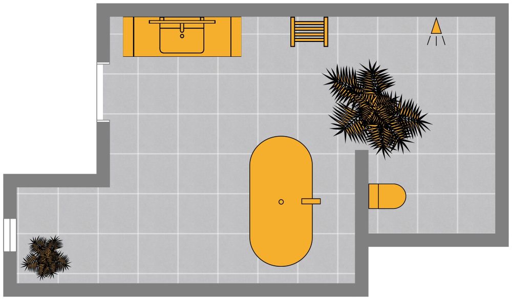 Sind Sie auf der Suche nach Inspiration für eine schöne Badezimmerdekoration? Der Grundriss mit Boho-Dekor bietet eine undurchsichtige Glasschwingtür, die in einen großen rechteckigen Bereich mit mehreren Vorsprüngen führt. Bei so viel Platz ist es ein Leichtes, das perfekte Hauptbadezimmer für Ihre Bedürfnisse einzurichten. Sie bevorzugen einen Doppelwaschtisch? Es gibt genügend Platz. Eine weitere Idee: Verlegen Sie die Toilette in die Ecke unten links und schaffen Sie eine luxuriöse Doppeldusche. Jede Menge Möglichkeiten! Die vom Boho-Stil inspirierte neutrale Farbpalette besteht aus hellgrauen, weißen und hellbraunen Tönen. Weitere ikonische Merkmale des Bohemian-Stils sind die gewebten Fußmatten und der Wäschekorb, die Gruppierung von Produktflaschen auf dem Waschtisch, der Handtuchhalter mit Holzleiter und der runde Spiegel mit Holzrahmen. Die kupfernen Pendelleuchten und eine große Auswahl an Grünpflanzen vervollständigen dieses Boho-Chic-Design.