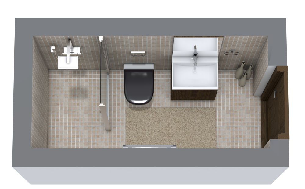 Lassen Sie sich von diesem Grundriss für ein schmales rechteckiges Badezimmer im modernen Stil inspirieren. Der Grundriss sieht vor, dass sich die Eingangstür an der kürzeren Seite des Rechtecks befindet und nach außen schwingt; es ist jedoch einfach, das Projekt zu öffnen und mit anderen Türvarianten zu spielen. Die Wände und der Boden sind mit neutralen beigen Fliesen und hellen Fugenmörteln ausgelegt, die eine ruhige und entspannende Atmosphäre schaffen. Ein bodenmontierter Waschtisch aus dunklem Holz bietet einen ausgezeichneten Kontrast - in den zwei praktischen Schubladen lässt sich das Durcheinander in Grenzen halten. Die quadratische Form des Waschbeckens trägt ebenso wie die kompakte Wandtoilette zu einer frischen und modernen Ausstrahlung bei. Eine begehbare Glas-Teilwand-Duschkabine lässt den Raum größer erscheinen und ist leicht zu reinigen und zu pflegen. Nickel-Armaturen und Bedienelemente fügen sich in die ruhige, neutrale Atmosphäre ein, ebenso wie der cremefarbene Badteppich.