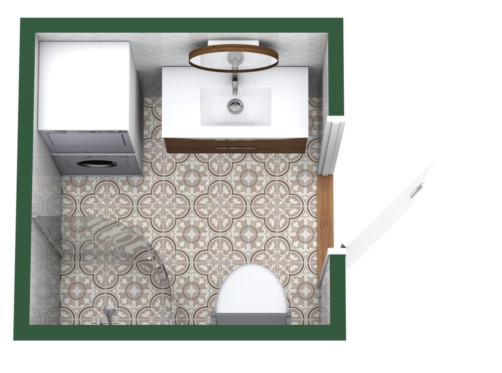 Dieser Grundriss für ein kleines, kompaktes Badezimmer verfügt über eine kompakt gestapelte Lösung für die Waschmaschine und den Trockner für ultimativen Wohnkomfort. Der Badezimmer-Eingang besteht aus einer Schwingtür, die Sie in beide Richtungen ausrichten können. Oder Sie fügen eine Schiebetür hinzu, um Platz zu sparen. Das schwebend angebrachte Waschbecken und die Toilette vermitteln ein Gefühl von Raum und Leichtigkeit, und in den funktionalen Schubladen unter dem Waschbecken können Sie Ihre Bad- und Reinigungsartikel verstauen. Zwei großartige Möglichkeiten für Ihre Duschkabine sind eine abgerundete Eckduschkabine oder eine Neo-Winkel-Duschkabine, eine dreiseitige Eckdusche aus Glas, bei der die vordere Ecke abgeschnitten ist ‒ die Duschtür sollte sich in beiden Fällen an der abgerundeten oder abgeschnittenen Ecke öffnen. Die Einrichtung dieses inspirierenden Badezimmers umfasst einen schönen mediterranen Fliesenboden und weiße Subway-Fliesen im Fischgrätmuster an den Wänden. Hölzerne Akzente am Spiegelrahmen und am Waschtisch nehmen die Farbe der Bodenfliesen auf und bringen einen Hauch von Natur in dieses schöne Design.
