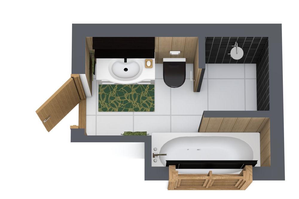 Wenn Sie eine getrennte Badewanne und Dusche bevorzugen, sollten Sie sich diesen Grundriss für ein Bad mit Badewanne und Dusche ansehen. Der Grundriss verfügt über eine Flügeltür, die Sie nach innen oder außen öffnen können, je nachdem, was Sie sonst noch vorhaben. Im Inneren des Badezimmers finden Sie ein schwebendes Waschbecken, eine schwebende Toilette, eine begehbare Dusche und eine Badewanne, die in einer Nische oder Ecke des Grundrisses untergebracht ist. Warmes Holz ist ein Markenzeichen des südwestlichen Stils und findet sich hier in der Wandverkleidung, der Holztür und dem Fensterrahmen wieder. Die Handtücher und der Teppich bringen Textur, Muster und Wüstenfarben ins Spiel, während die schwarzen Fensterjalousien, der Spiegelrahmen und die Wandfliesen in der Dusche einen schönen Kontrast zu den großformatigen weißen Bodenfliesen bilden.