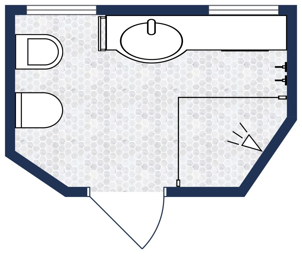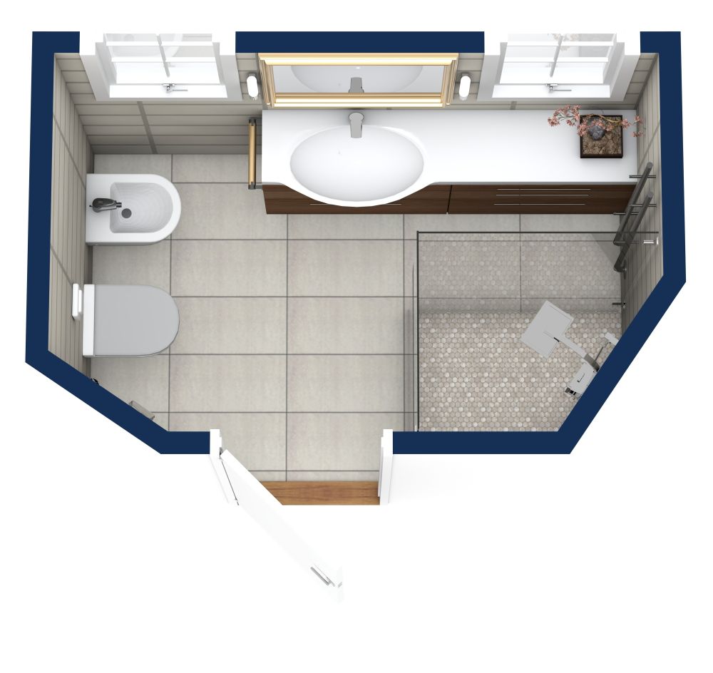 Dieser Grundriss für ein kleines klassisches Badezimmer zeigt eine Möglichkeit, die Badelemente anzuordnen, wenn Sie eine ungewöhnliche Grundfläche haben. Beim Betreten durch die Schwingtür fällt der lange Euro-Waschtisch mit abgerundetem Waschbecken auf, der aus dem schmalen Waschtisch herausragt. Dank der Schubladen und der langen Ablagefläche ist dies eine praktische Wahl für den schmalen Raum. Vertikale Leuchten auf beiden Seiten des Spiegels ergänzen die Fenster, die viel Licht und frische Luft hereinlassen. Der Grundriss umfasst auch eine wandmontierte Toilette und ein Bidet sowie eine begehbare Dusche. Ein beruhigendes, neutrales Farbschema aus Weiß, Beige und Braun lässt den Raum großzügig und sauber erscheinen. Die großformatigen weißen Fliesen auf dem Boden und die beigen Fliesen an den Wänden sind in einer modernen Stapelanordnung verlegt und verleihen dem Raum einen modernen Touch.
