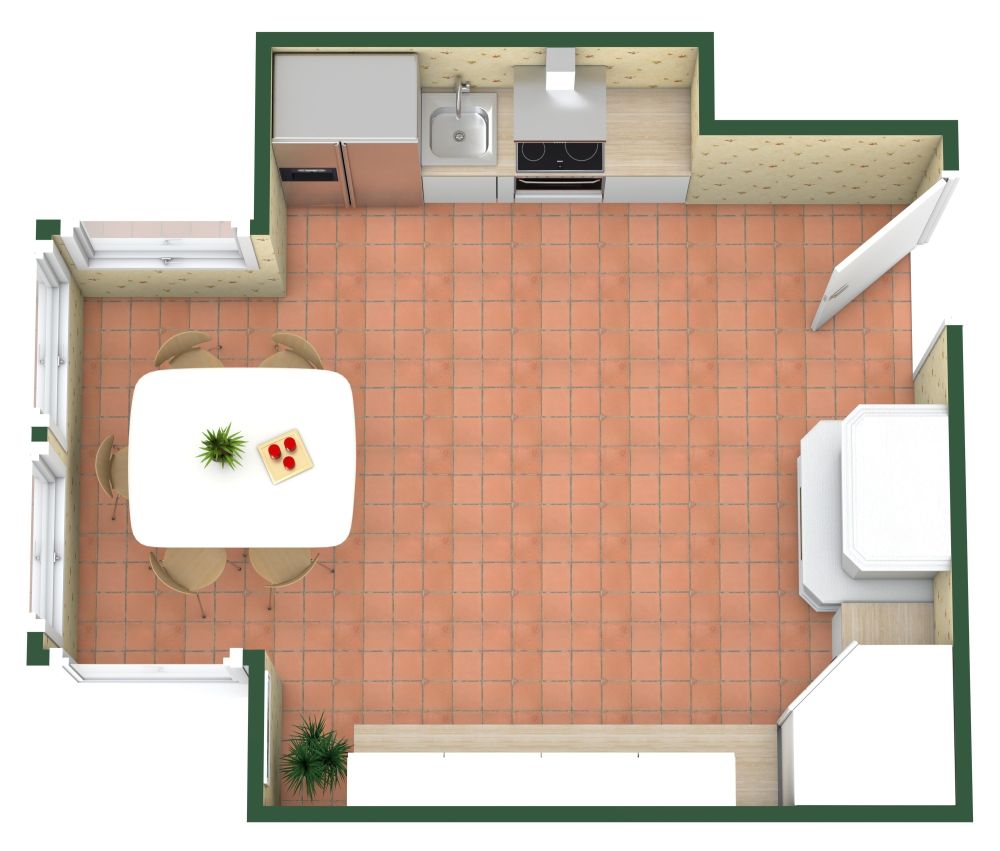 Versetzen Sie sich in die Vergangenheit und genießen Sie gleichzeitig eine Reihe moderner Details in dieser stilvollen Idee für eine Retroküche. Durch eine strahlend weiße Tür betreten Sie diesen erfrischenden Raum mit orangefarbenen Kachelböden im Vintage-Stil, Tapeten mit Blumendruck und schlichten weißen Schränken, die Ihnen das Gefühl geben, in der modernisierten Küchenvariante Ihrer Kindheit zu sein. Helle Holzarbeitsplatten und schlichte Edelstahlgeräte verteilen sich in der Küche und lassen viel Platz zum Kochen, Bewirten und Bewegen. Der Mittelpunkt des Raums ist eine von vier großen Fenstern umgebene Ecke, die den Raum perfekt beleuchtet und der ideale Platz für einen Frühstückstisch mit Stühlen ist, wie dieser einfache, aber stilvolle Tisch. Wenn Sie auf der Suche nach Ideen für eine Retro-Kücheneinrichtung sind, die Ihrer Familie über Jahre hinweg eine schöne Kulisse für ihre Erinnerungen bietet, dann ist dies die richtige Küche für Sie.